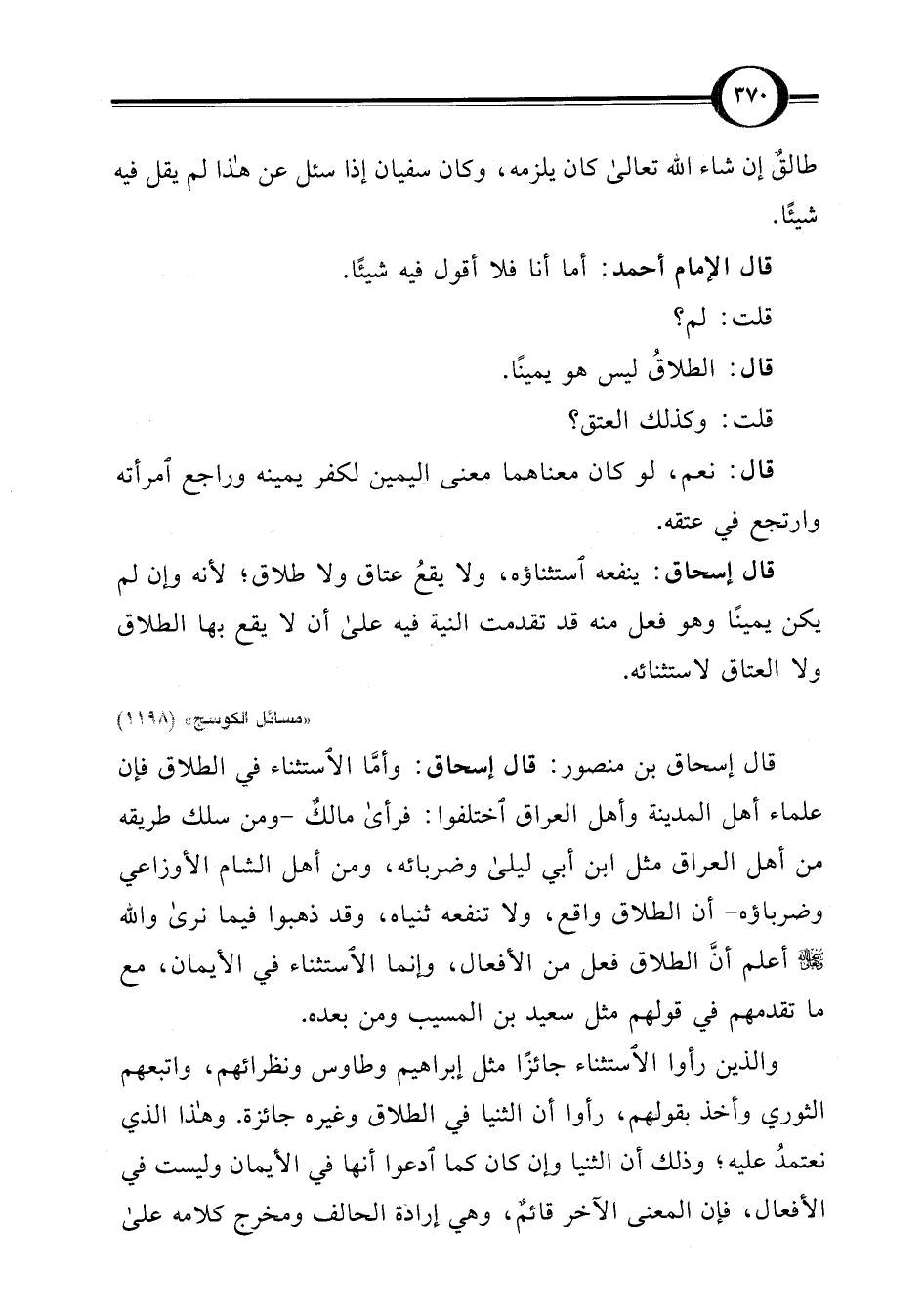 قال إسحاق بن منصور: قال إسحاق: وأمَّا الاستثناء في الطلاق فإن علماء أهل المدينة وأهل العراق اختلفوا: فرأى مالكٌ -ومن سلك طريقه من أهل العراق مثل ابن أبي ليلى وضربائه، ومن أهل الشام الأوزاعي وضرباؤه- أن الطلاق واقع، ولا تنفعه ثنياه، وقد ذهبوا فيما نرى واللَّه -صلى اللَّه عليه وسلم-، أعلم أنَّ الطلاق فعل من الأفعال، وإنما الاستثناء في الأيمان، مع ما تقدمهم في قولهم مثل سعيد بن المسيب ومن بعده.