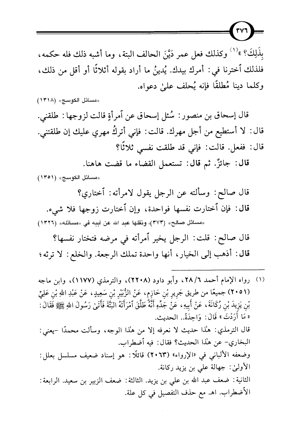 (¬1) رواه الإمام أحمد 6/ 28، وأبو داود (2208)، والترمذي (1177)، وابن ماجه (2051) جميعًا من طريق جَرِيرِ بْنِ حَازِمٍ، عَنْ الزُّبَيْرِ بْنِ سَعِيدٍ، عَنْ عَبْدِ اللَّهِ بْنِ عَلِيِّ بْنِ يَزِيدَ بْنِ رُكَانَةَ، عَنْ أَبِيهِ، عَنْ جَدِّهِ أَنَّهُ طَلَّقَ أمْرَأَتَهُ البَتَّةَ فَأَتَى رَسُولَ اللَّهِ -صلى اللَّه عليه وسلم- فَقَالَ: "مَا أَرَدْتَ" قَالَ: وَاحِدَةً. . الحديث.