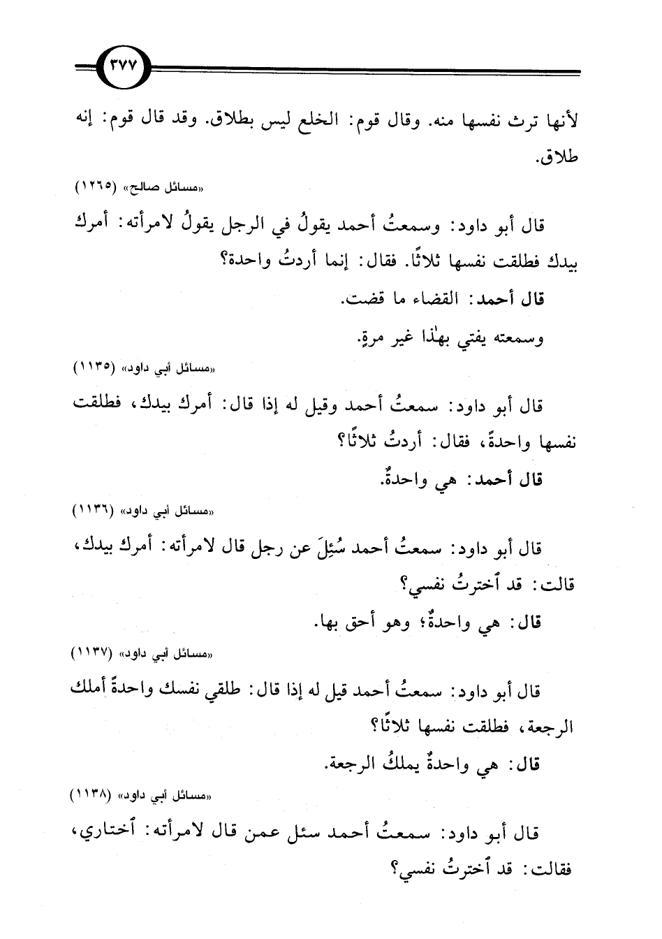قال أبو داود: سمعتُ أحمد سُئِلَ عن رجل قال لامرأته: أمرك بيدك، قالت: قد اخترتُ نفسي؟
