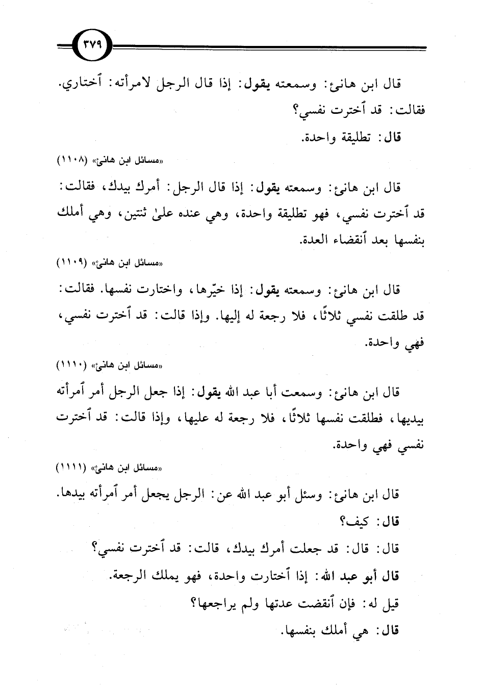 قال ابن هانئ: وسمعته يقول: إذا خيّرها، واختارت نفسها. فقالت: قد طلقت نفسي ثلاثًا، فلا رجعة له إليها. وإذا قالت: قد اخترت نفسي، ففي واحدة.