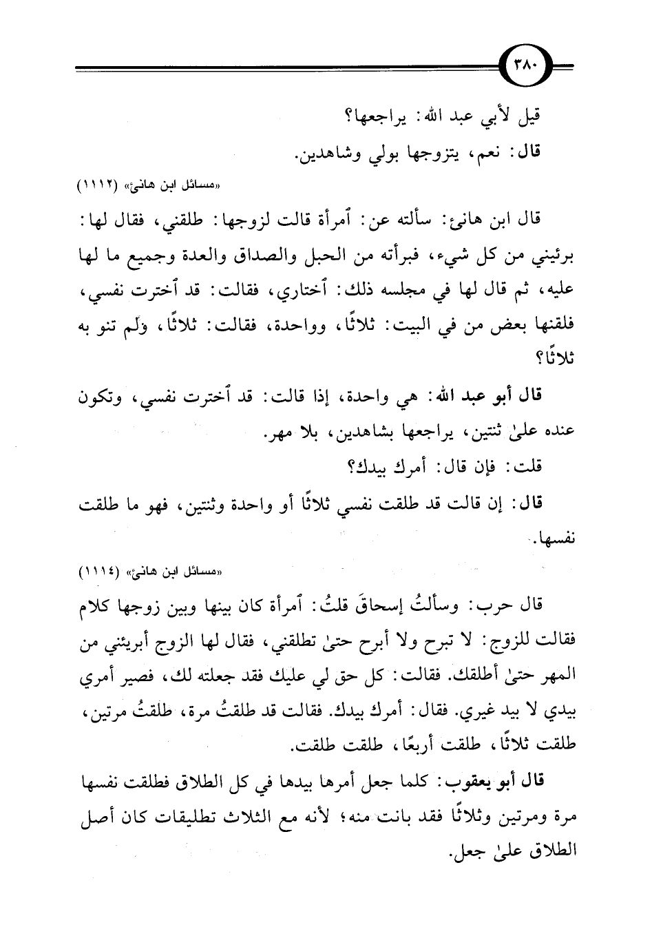 قال حرب: وسألتُ إسحاقَ قلتُ: امرأة كان بينها وبين زوجها كلام فقالت للزوج: لا تبرح ولا أبرح حتى تطلقني، فقال لها الزوج أبريئني من المهر حتى أطلقك. فقالت: كل حق لي عليك فقد جعلته لك، فصير أمري بيدي لا بيد غيري. فقال: أمرك بيدك. فقالت قد طلقتُ مرة، طلقتُ مرتين، طلقت ثلاثًا، طلقت أربعًا، طلقت طلقت.