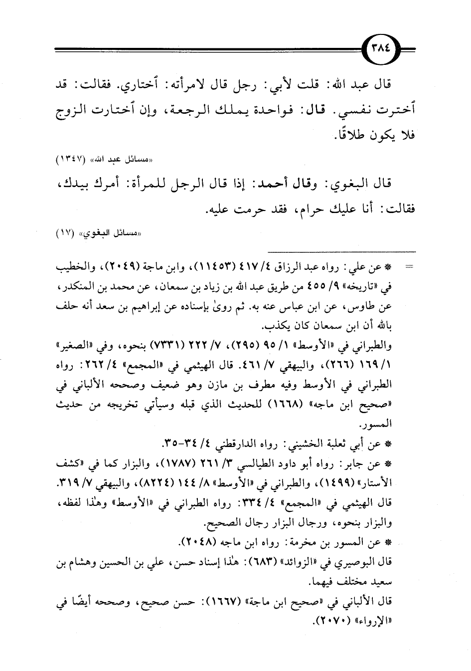 قال عبد اللَّه: قلت لأبي: رجل قال لامرأته: اختاري. فقالت: قد اخترت نفسي. قال: فواحدة يملك الرجعة، وإن اختارت الزوج فلا يكون طلاقًا.