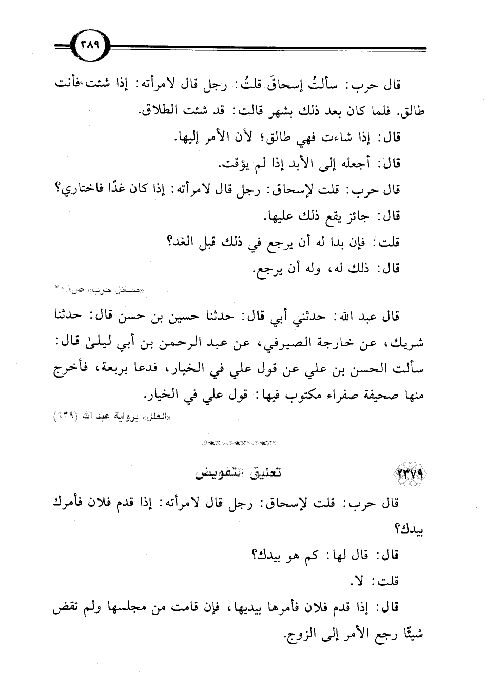 قال حرب: سألتُ إسحاقَ قلتُ: رجل قال لامرأته: إذا شئت فأنت طالق. فلما كان بعد ذلك بشهر قالت: قد شئت الطلاق.