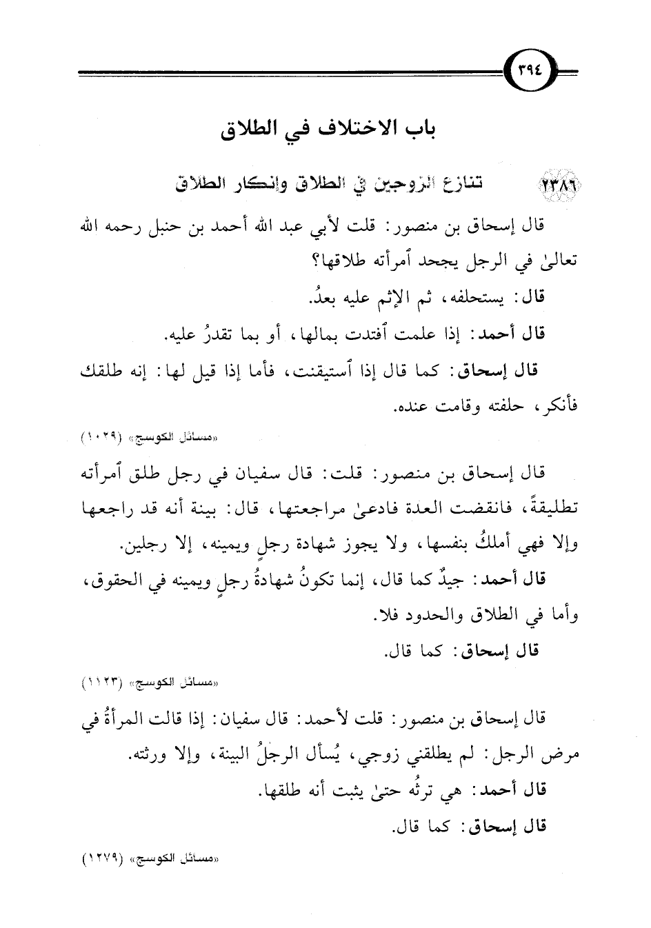 قال إسحاق بن منصور: قلت لأبي عبد اللَّه أحمد بن حنبل رحمه اللَّه تعالى في الرجل يجحد امرأته طلاقها؟
