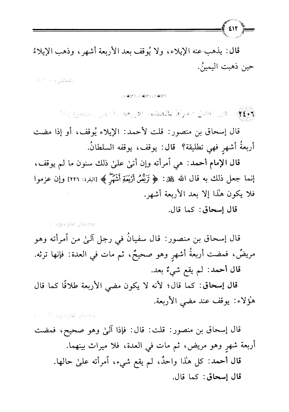 قال إسحاق بن منصور: قلت لأحمد: الإيلاء يُوقف، أو إذا مضت أربعةُ أشهرٍ فهي تطليقة؟ قال: يوقف، يوقفه السلطانُ.