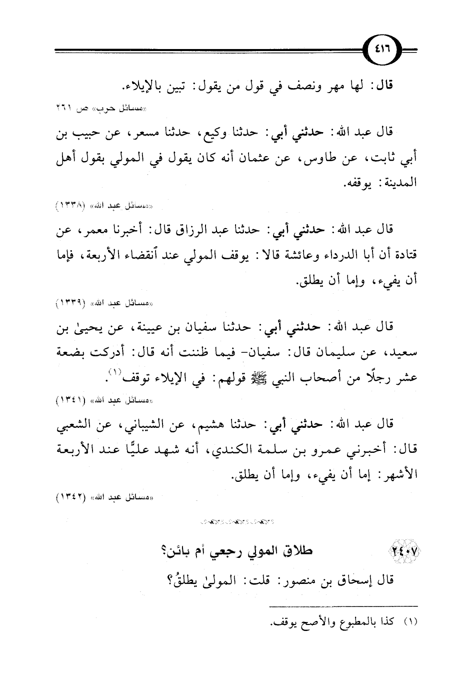 قال عبد اللَّه: حدثني أبي: حدثنا سفيان بن عيينة، عن يحيى بن سعيد، عن سليمان قال: سفيان -فيما ظننت أنه قال: أدركت بضعة عشر رجلًا من أصحاب النبي -صلى اللَّه عليه وسلم- قولهم: في الإيلاء توقف (¬1).