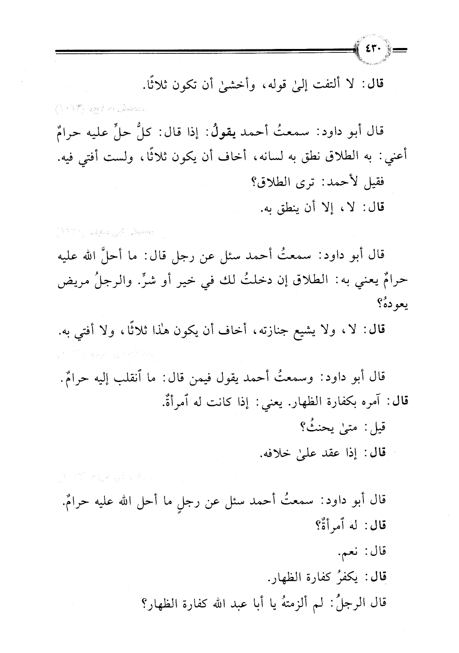 قال أبو داود: سمعتُ أحمد سئل عن رجلٍ ما أحل اللَّه عليه حرامٌ.