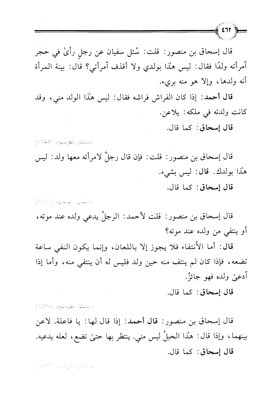 قال إسحاق بن منصور: قلت: سُئل سفيان عن رجلٍ رأى في حجر امرأته ولدًا فقال: ليس هذا بولدي ولا أقذف امرأتي؟ قال: بينة المرأة أنه ولدها، وإلا هو منه بريء.