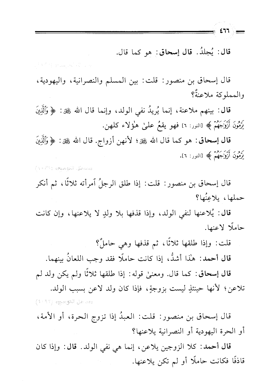 قال إسحاق بن منصور: قلت: بين المسلم والنصرانية، واليهودية، والمملوكة ملاعنةٌ؟