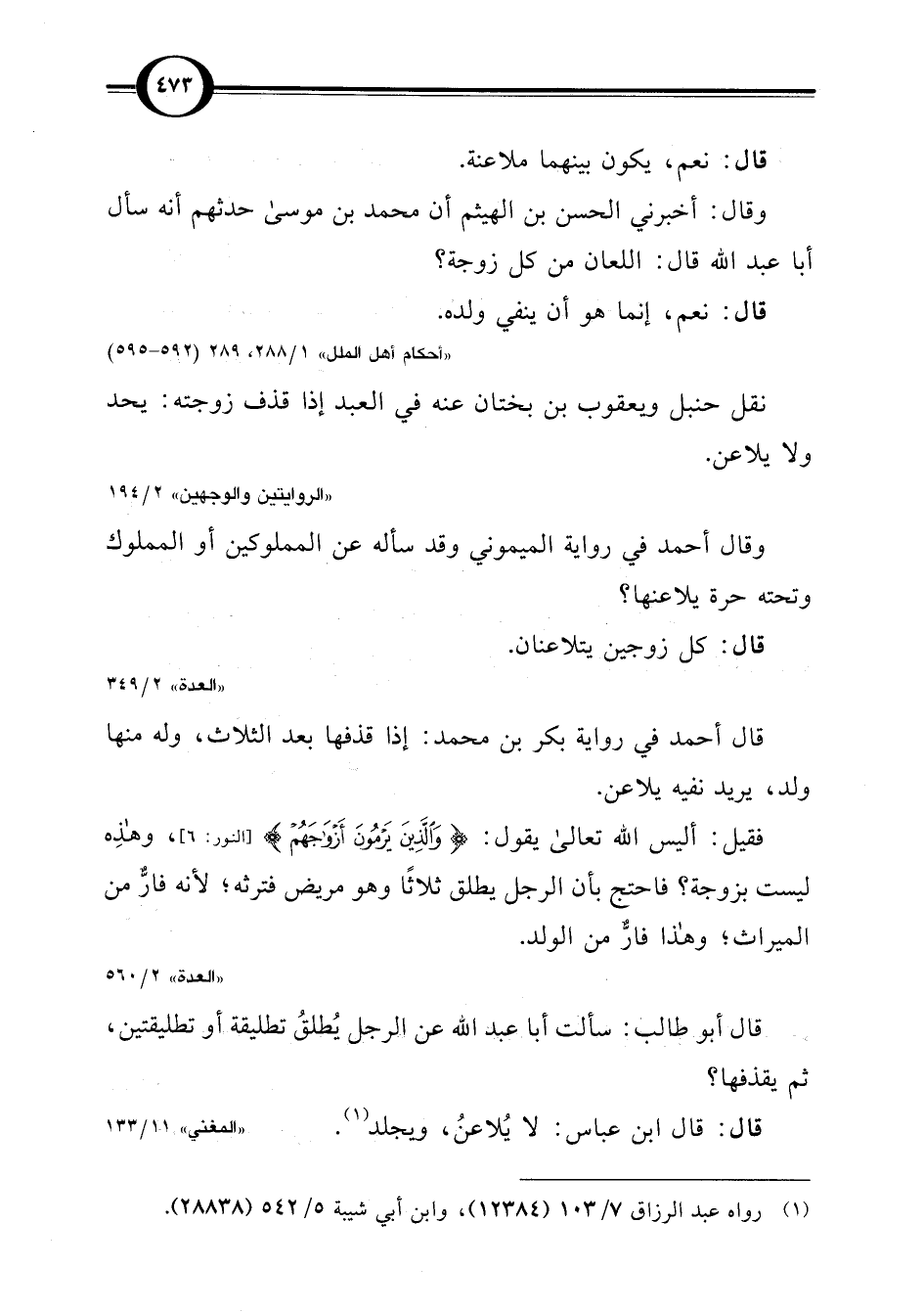 نقل حنبل ويعقوب بن بختان عنه في العبد إذا قذف زوجته: يحد ولا يلاعن.