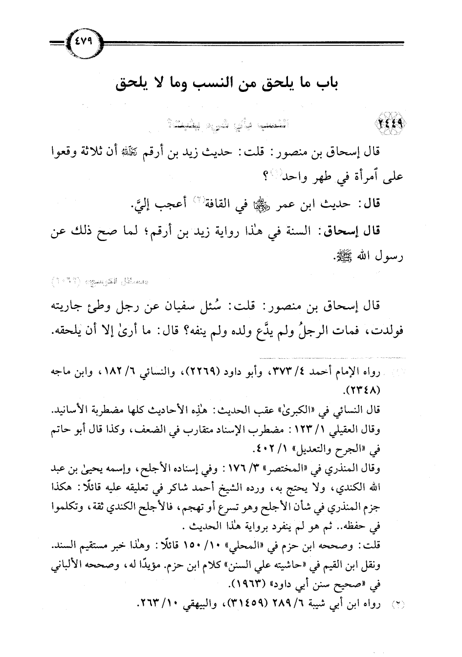 قال إسحاق بن منصور: قلت: حديث زيد بن أرقم رحمه اللَّه أن ثلاثة وقعوا على امرأة في طهر واحد (¬1)؟