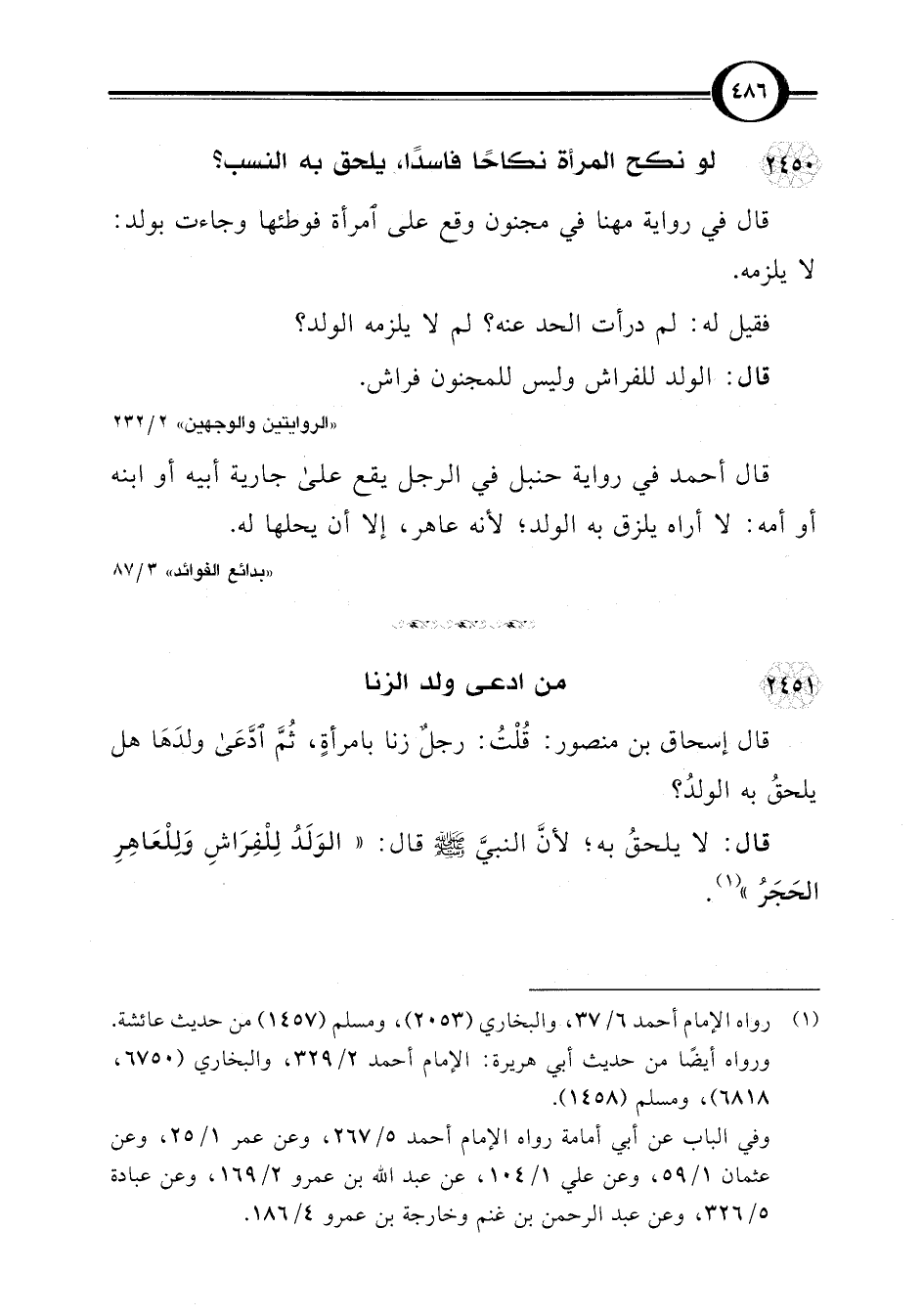 قال إسحاق بن منصور: قُلْتُ: رجلٌ زنا بامرأةٍ، ثُمَّ ادَّعَى ولدَهَا هل يلحقُ به الولدُ؟