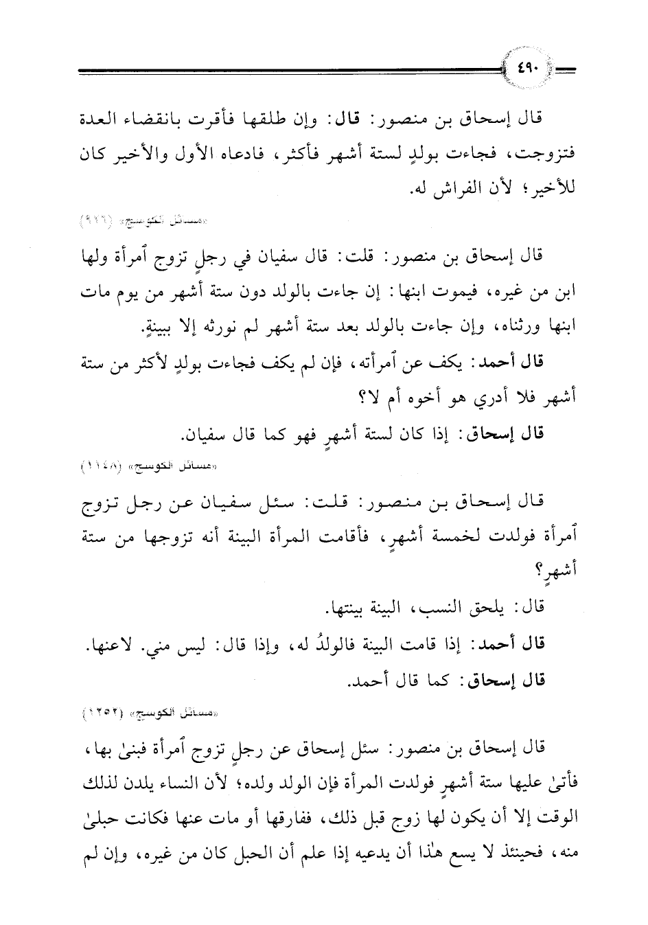 قال إسحاق بن منصور: سئل إسحاق عن رجلٍ تزوج امرأة فبنى بها، فأتى عليها ستة أشهرٍ فولدت المرأة فإن الولد ولده؛ لأن النساء يلدن لذلك الوقت إلا أن يكون لها زوج قبل ذلك، ففارقها أو مات عنها فكانت حبلى منه، فحينئذ لا يسع هذا أن يدعيه إذا علم أن الحبل كان من غيره، وإن لم