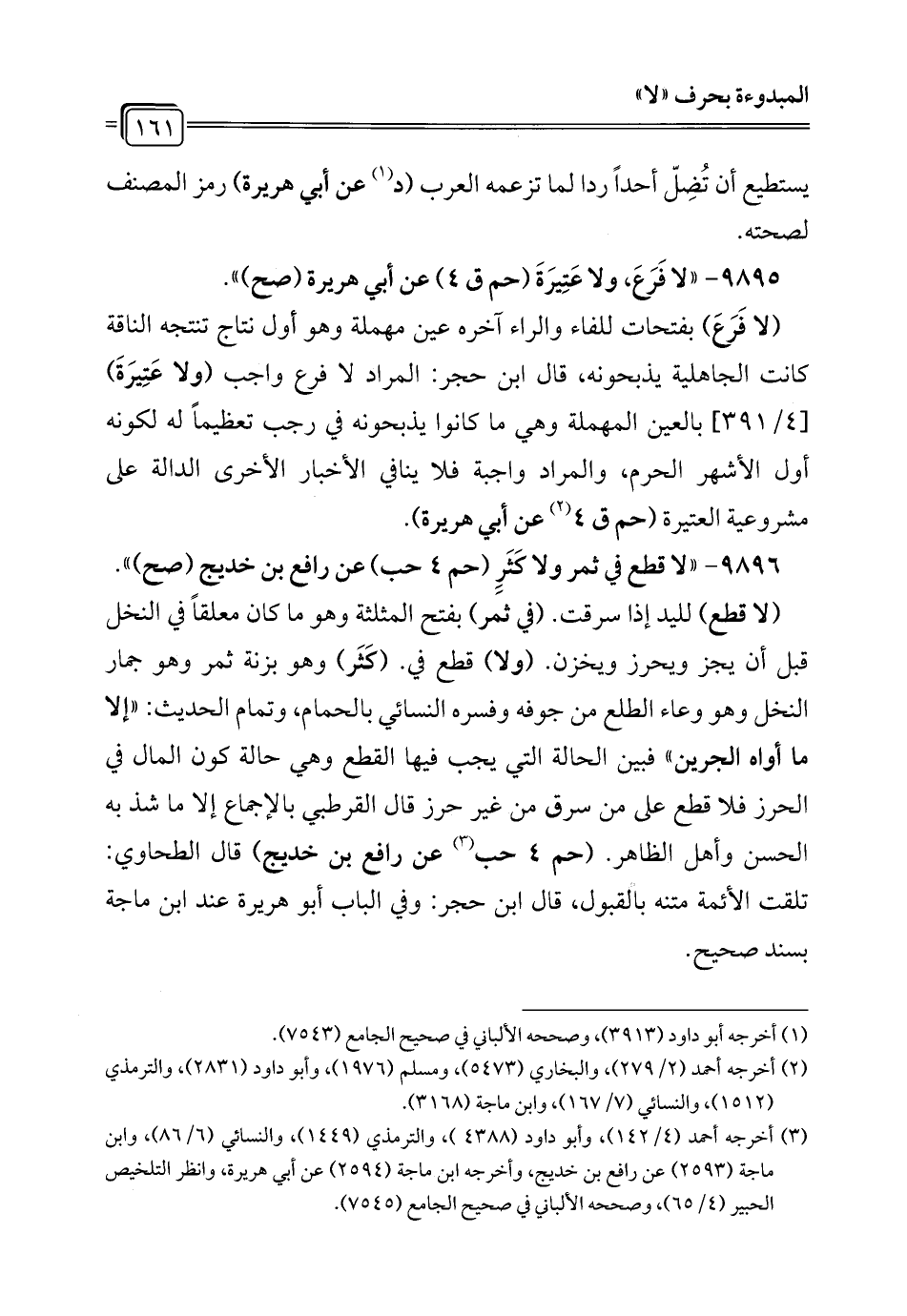 9895 - "لا فَرَعَ، ولا عَتِيرَةَ (حم ق 4) عن أبي هريرة (صح) ".