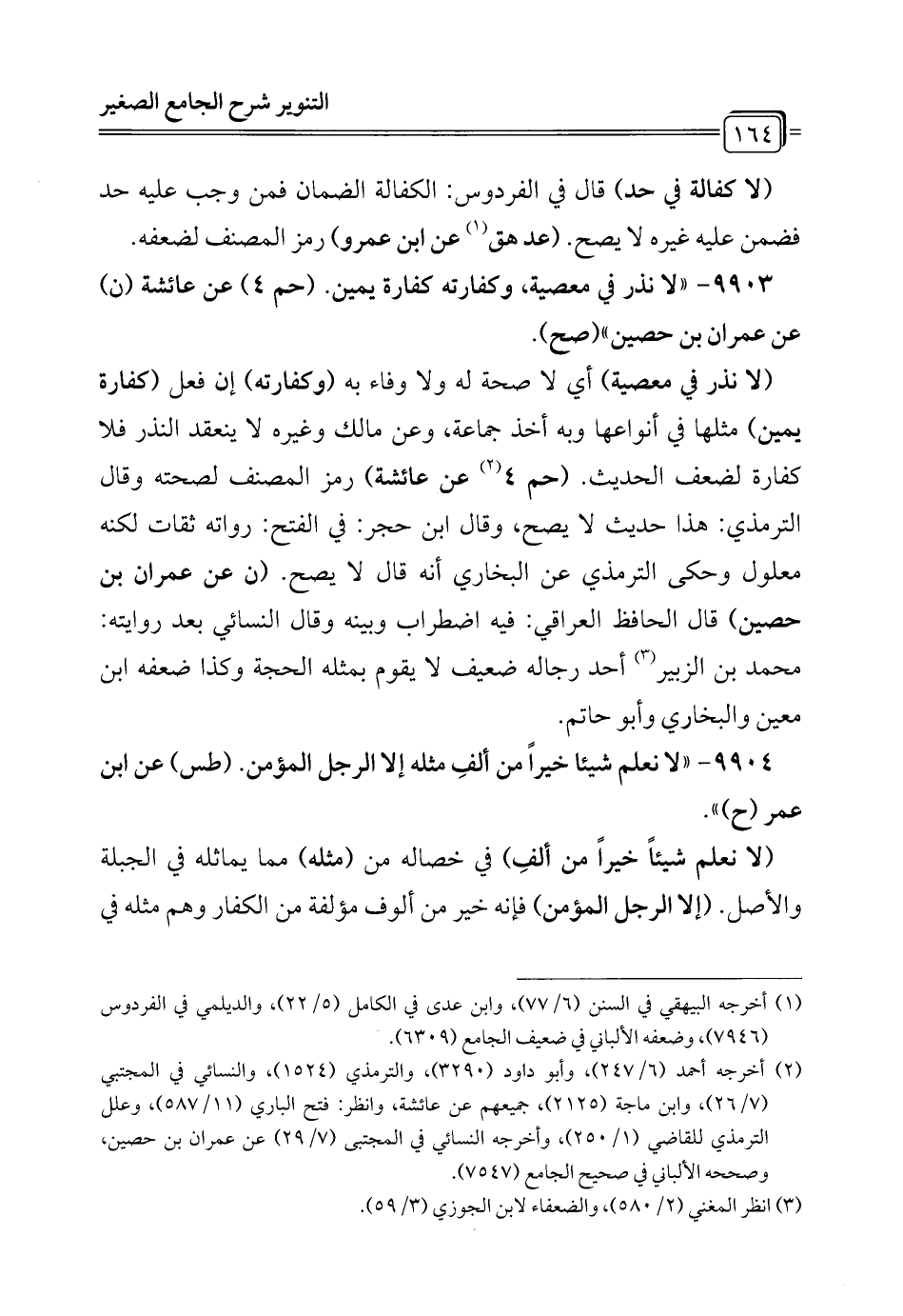 9903 - "لا نذر في معصية، وكفارته كفارة يمين. (حم 4) عن عائشة (ن) عن عمران بن حصين" (صح).
