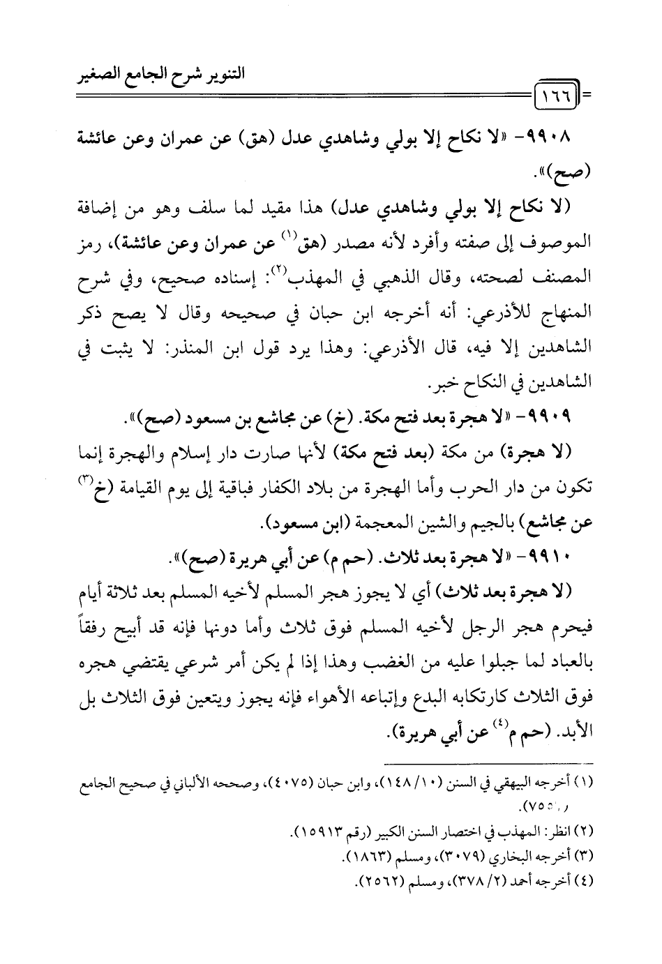 9908 - "لا نكاح إلا بولي وشاهدي عدل (هق) عن عمران وعن عائشة (صح) ".