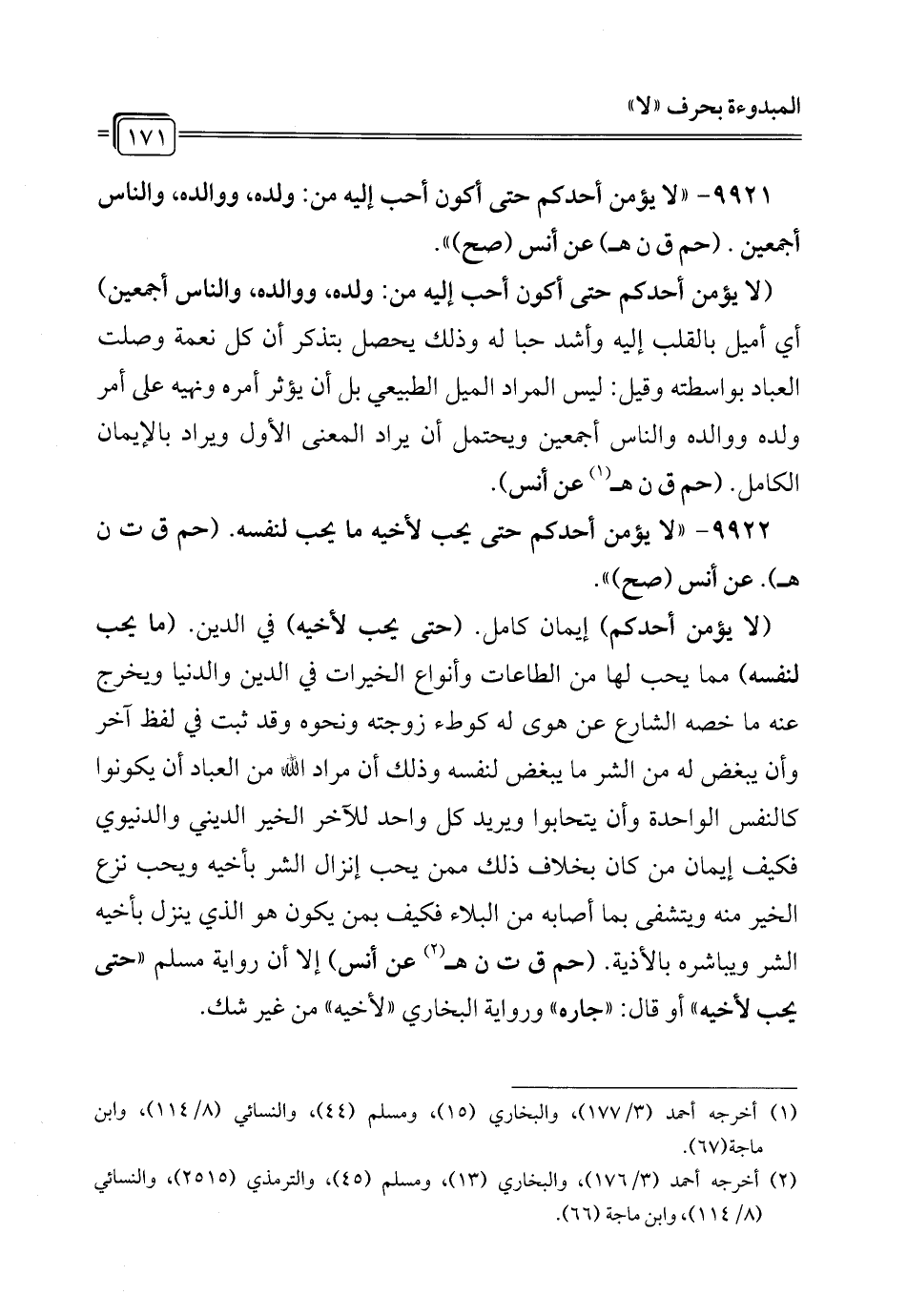 9921 - "لا يؤمن أحدكم حتى أكون أحب إليه من: ولده، ووالده، والناس أجمعين. (حم ق ن هـ) عن أنس (صح) ".