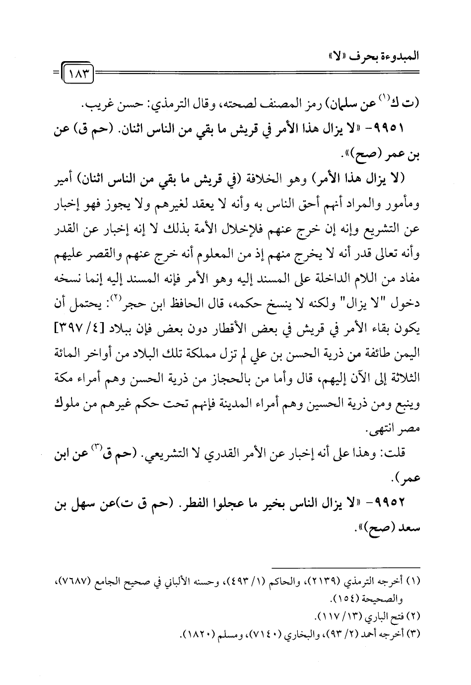 9951 - "لا يزال هذا الأمر في قريش ما بقي من الناس اثنان. (حم ق) عن بن عمر (صح) ".