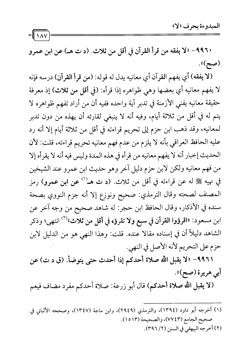 9960 - "لا يفقه من قرأ القرآن في أقل من ثلاث. (د ت هـ) عن ابن عمرو (صح) ".