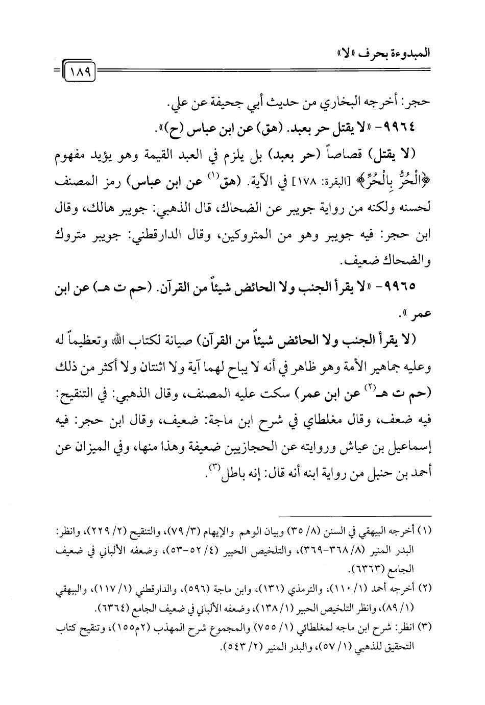 9964 - "لا يقتل حر بعبد. (هق) عن ابن عباس (ح) ".
