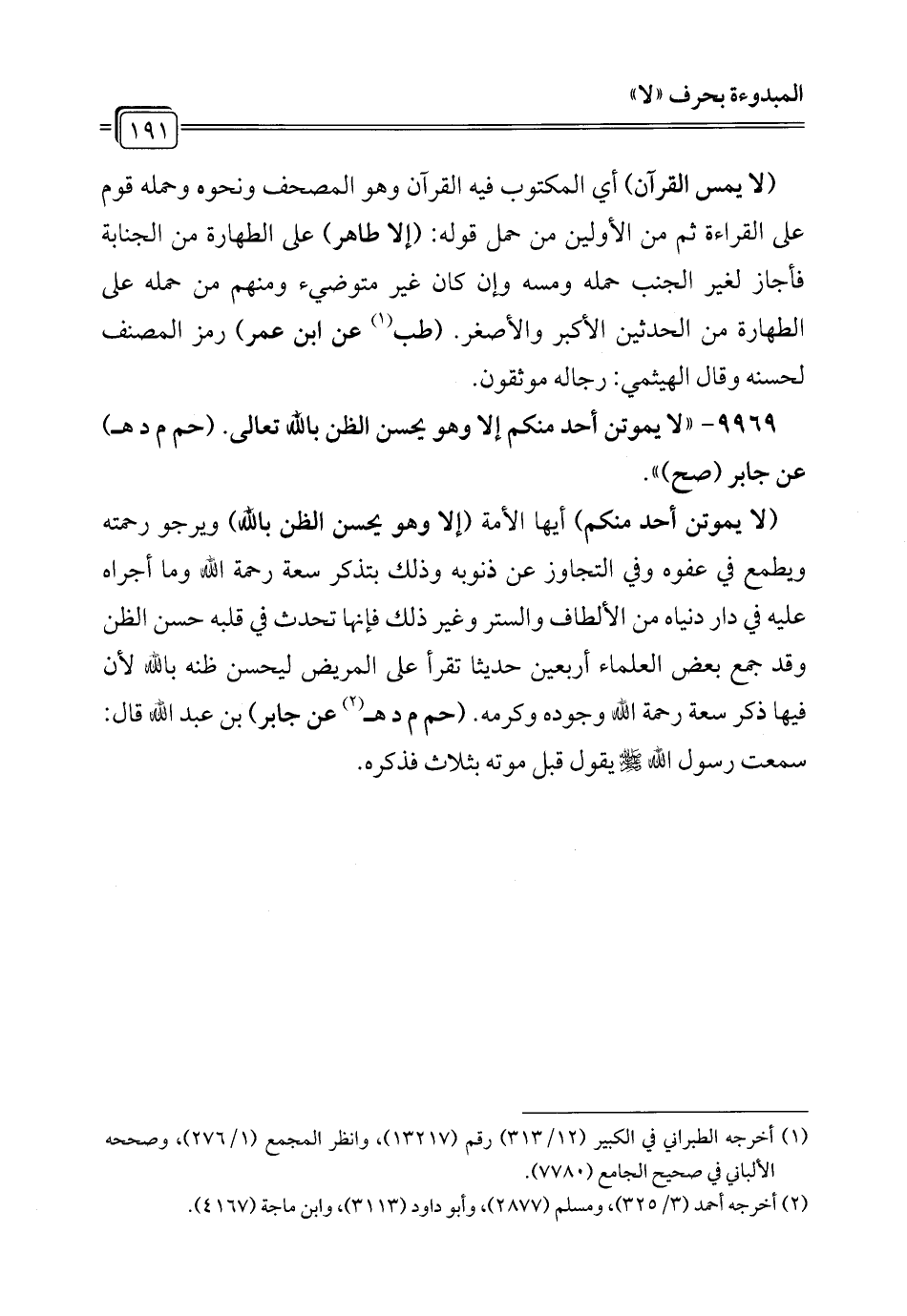 9969 - "لا يموتن أحد منكم إلا وهو يحسن الظن بالله تعالى. (حم م د هـ) عن جابر (صح) ".