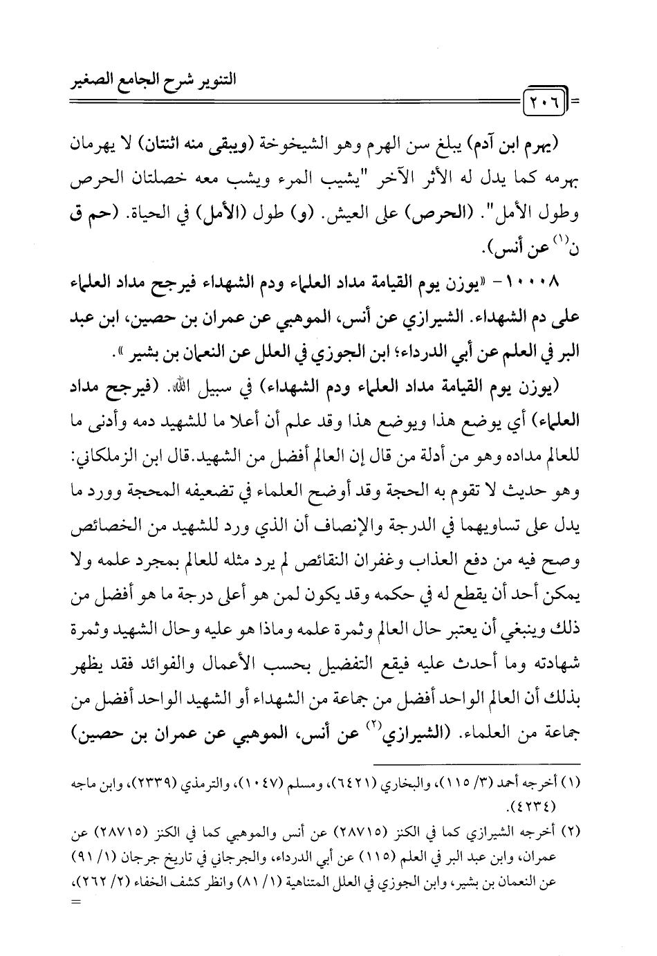 10008 - "يوزن يوم القيامة مداد العلماء ودم الشهداء فيرجح مداد العلماء على دم الشهداء. الشيرازي عن أنس، الموهبي عن عمران بن حصين، ابن عبد البرقي العلم عن أبي الدرداء؛ ابن الجوزي في العلل عن النعمان بن بشير".