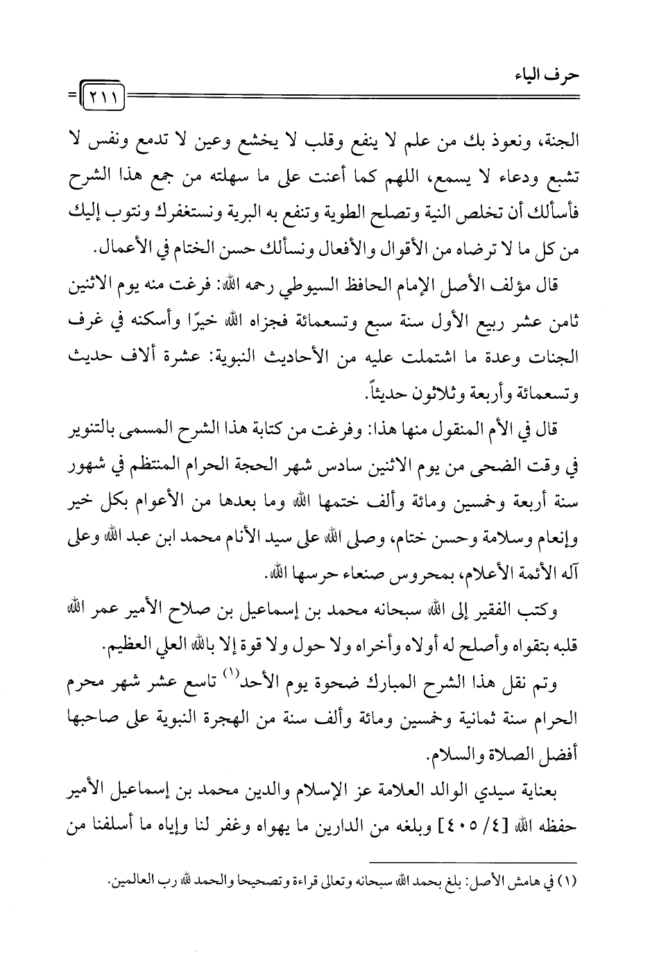 قال في الأم المنقول منها هذا: وفرغت من كتابة هذا الشرح المسمى بالتنوير في وقت الضحى من يوم الاثنين سادس شهر الحجة الحرام المنتظم في شهور سنة أربعة وخمسين ومائة وألف ختمها الله وما بعدها من الأعوام بكل خير وإنعام وسلامة وحسن ختام، وصلى الله على سيد الأنام محمَّد ابن عبد الله وعلى آله الأئمة الأعلام، بمحروس صنعاء حرسها الله.