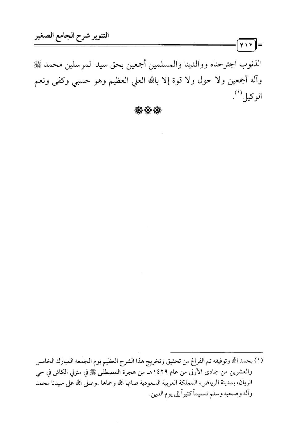 (¬1) بحمد الله وتوفيقه تم الفراغ من تحقيق وتخريج هذا الشرح العظيم يوم الجمعة المبارك الخامس والعشرين من جمادى الأولى من عام 1429 هـ من هجرة المصطفى - صلى الله عليه وسلم - في منزلي الكائن في حي الريان، بمدينة الرياض، المملكة العربية السعودية صانها الله وحماها. وصلى الله على سيدنا محمَّد وآله وصحبه وسلم تسليمًا كثيرًا إلى يوم الدين.