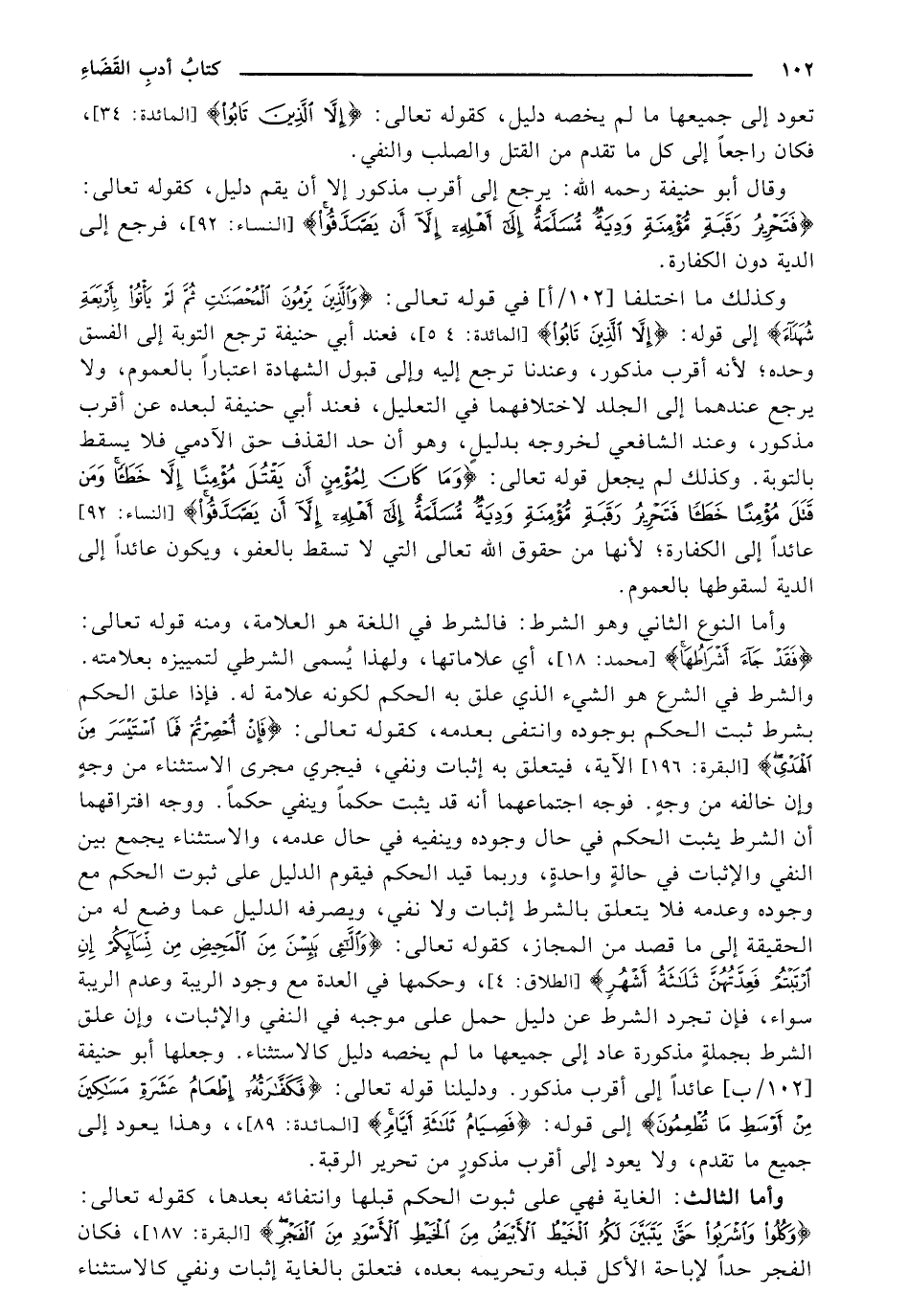 وأما النوع الثاني وهو الشرط: فالشرط في اللغة هو العلامة، ومنه قوله تعالى: {فَقَدْ جَاءَ أَشْرَاطُهَا} [محمد: 18]، أي علاماتها، ولهذا يُسمى بالشرطي لتمييزه بعلامته. والشرط في الشرع هو الشيء الذي علق به الحكم لكونه علامة له. فإذا علق الحكم بشرط ثبت الحكم بوجوده وانتفى بعدمه، كقوله تعالى: {فَإِنْ أُحْصِرْتُمْ فَمَا اسْتَيْسَرَ مِنْ الْهَدْيِ} [البقرة: 196] الآية، فيتعلق به إثبات ونفي، فيجري مجرى الاستثناء من وجه وإن خالفه من وجه. فوجه اجتماعهما أنه قد يثبت حكمًا وينفي حكمًا. ووجه افتراقهما أن الشرط يثبت الحكم في حال وجوده وينفيه في حال عدمه، والاستثناء يجمع بين النفي والإثبات في حالة واحدة، وربما قيد الحكم فيقوم الدليل على ثبوت الحكم مع وجوده وعدمه فلا يتعلق بالشرط إثبات ولا نفي، ويصرفه الدليل عما وضع له من الحقيقة إلى ما قصد من المجاز، كقوله تعالى: {وَاللاَّئِي يَئِسْنَ مِنْ الْمَحِيضِ مِنْ نِسَائِكُمْ إِنْ ارْتَبْتُمْ فَعِدَّتُهُنَّ ثَلاثَةُ أَشْهُرٍ} [الطلاق: 4]، وحكمها في العدة مع وجود الريبة وعدم الريبة سواء، فإن تجرد الشرط عن دليل حمل على موجبه في النفي والإثبات، وإن علق الشرط بجملة مذكورة عاد إلى جميعها ما لم يخصه دليل كالاستثناء. وجعلها أبو حنيفة [102/ب] عائدًا إلى أقرب مذكور. ودليلنا قوله تعالى: {فَكَفَّارَتُهُ إِطْعَامُ عَشَرَةِ مَسَاكِينَ مِنْ أَوْسَطِ مَا تُطْعِمُونَ} إلى قوله: {فَصِيَامُ ثَلاثَةِ أَيَّامٍ} [المائدة: 89]، وهذا يعود إلى جميع ما تقدم، ولا يعود إلى أقرب مذكور من تحرير الرقبة.