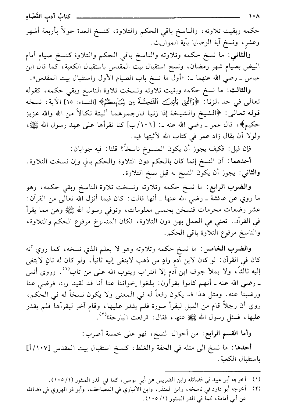 والضرب الرابع: ما نسخ حكمه وتلاوته ونسخت تلاوة الناسخ وبقي حكمه، وهو ما روي عن عائشة - رضي الله عنها - أنها قالت: كان فيما أنزل الله تعالى من القرآن: عشر رضعات محرمات فنسخن بخمس معلومات، وتوفي رسول الله صلى الله عليه وسلم وهن مما يقرأ في القرآن. تعني في العمل بهن دون التلاوة، فكان المنسوخ مرفوع الحكم والتلاوة، والناسخ مرفوع التلاوة باقي الحكم.