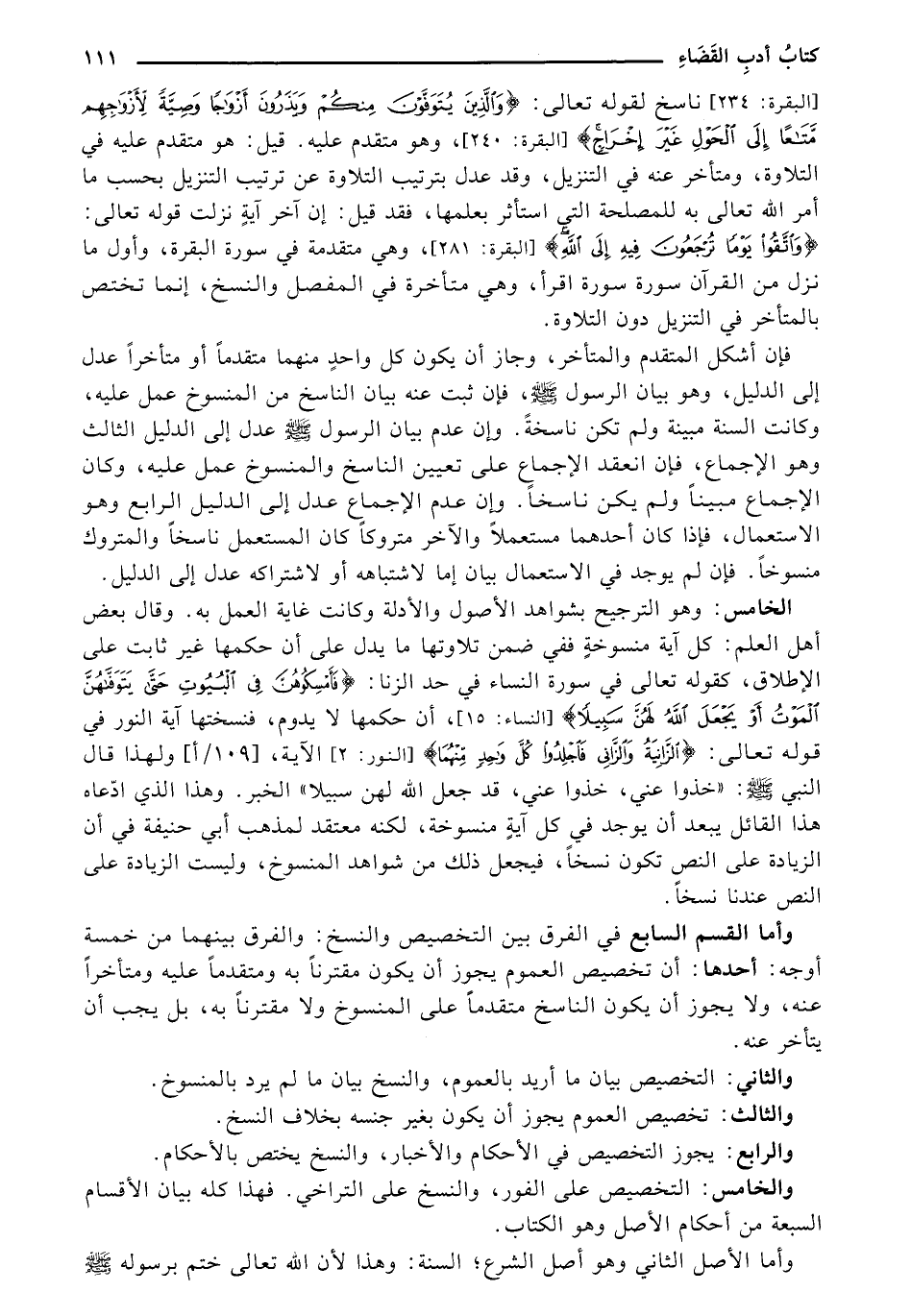 وأما القسم السابع في الفرق بين التخصيص والنسخ: والفرق بينهما من خمسة أوجه: أحدها: أن تخصيص العموم يجوز أن يكون مقترنا بت ومتقدما عليه ومتأخرا عنه، ولا يجوز أن يكون الناسخ متقدماً على المنسوخ ولا مقرتنا بت، بل يجب أن يتأخر عنه.