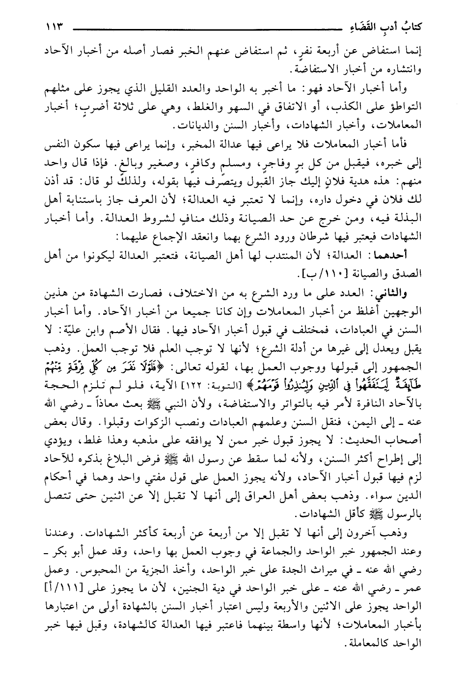 وذهب آخرون إلى أنها لا تقبل إلا من أربعة عن أربعة كأكثر الشهادات. وعندنا وعند الجمهور خبر الواحد والجماعة في وجوب العمل بتا واحد، وقد عمل أبو بكر- رضي الله عنه- في ميراث الجدة على خبر الواحد، وأخذ الجزية من المحبوس. وعمل عمر- رضي الله عنه- على خبر الواحد في دية الجنين، لأن ما يجوز على [111/ أ] الواحد يجوز على الاثنين والأربعة وليس اعتبار أخبار السنن بالشهادة أولى من اعتبارها بأخبار المعاملات؛ لأنها واسطة بينهما فاعتبر فيها العدالة كالشهادة، وقبل خبر الواحد كالمعاملة.