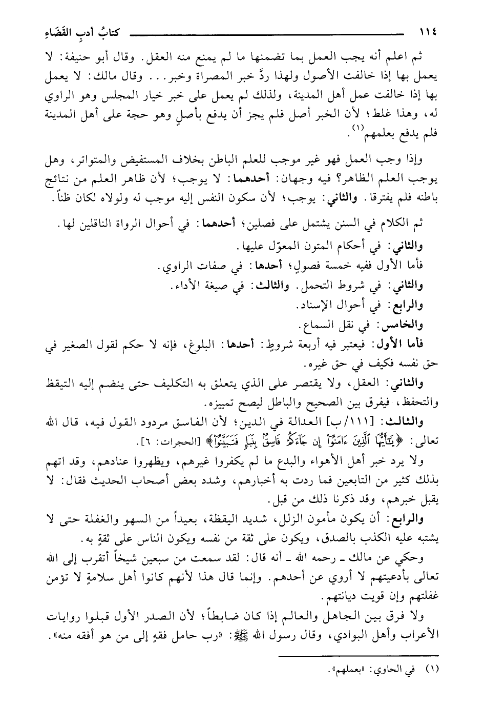 وإذا وجب العمل فهو غير موجب للعلم الباطن بخلاف المستفيض والمتواتر، وهل يوجب العلم الظاهر؟ فيه وجهان: أحدهما: ليوجب؛ لأن ظاهر العلم من نتائج باطنه فلم يفترقا. والثاني: يوجب؛ لأن سكون النفس إليه موجب له ولولاه لكان ظناً ثم الكلام في السنن يشتمل على فصلين؛ أحدهما: في أحوال الرواة الناقلين لها.