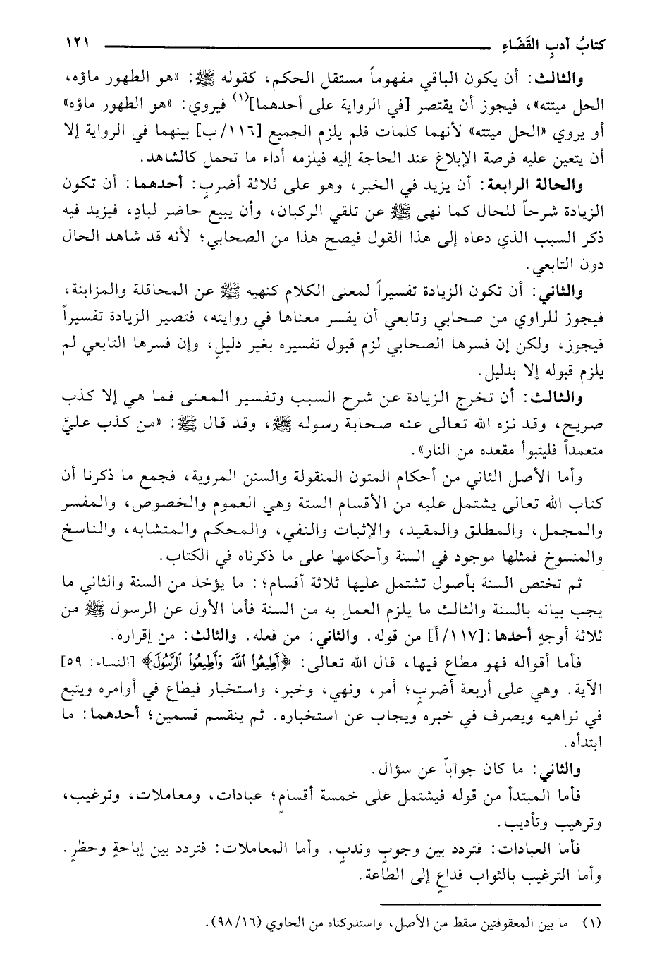 والثالث: أن يكون الباقي مفهومًا مستقل الحكم، كقوله صلى الله عليه وسلم: "هو الطهور ماؤه، الحل ميتته"، فيجوز أن يقتصر [في الرواية على أحدهما] فيروي: "هو الطهور ماؤه" أو يروي "الحل ميتته" لأنهما كلمات فلم يلزم الجميع [116/ ب] بينهما في الرواية إلا أن يتعين عليه فرصة الإبلاغ عند الحاجة إليه فيلزمه أداء ما تحمل كالشاهد.