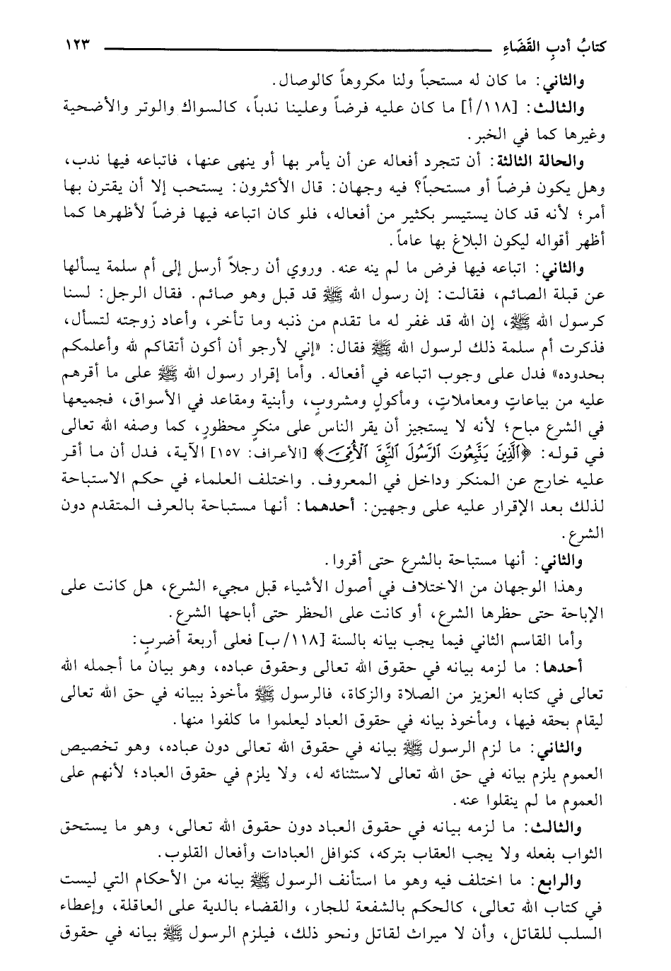 والرابع: ما اختلف فيه وهو ما استأنف الرسول صلى الله عليه وسلم بيانه من الأحكام التي ليست في كتاب الله تعالى، كالحكم بالشفعة للجار، والقضاء بالدية على العاقلة، وإعطاء السلب للقاتل، وأن لا ميراث لقاتل ونحو ذلك، فيلزم الرسول صلى الله عليه وسلم بيانه في حقوق