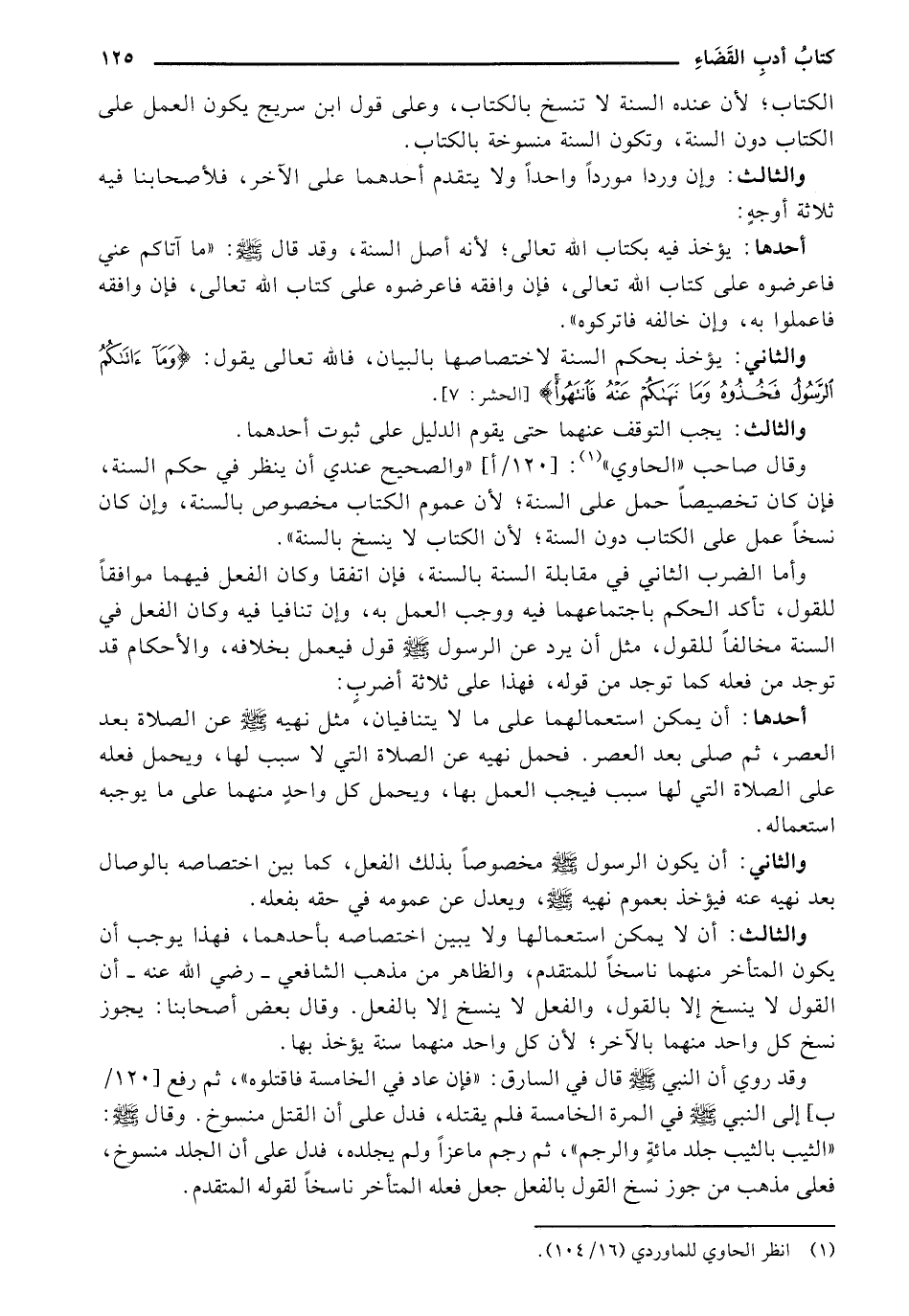 وقال صاحب "الحاوي": [120/ أ] "والصحيح عندي أن ينظر في حكم السنة، فإن كان تخصيصًا حمل على السنة؛ لأن عموم الكتاب مخصوص بالسنة، وإن كان نسخًا عمل على الكتاب دون السنة؛ لأن الكتاب لا ينسخ بالسنة".