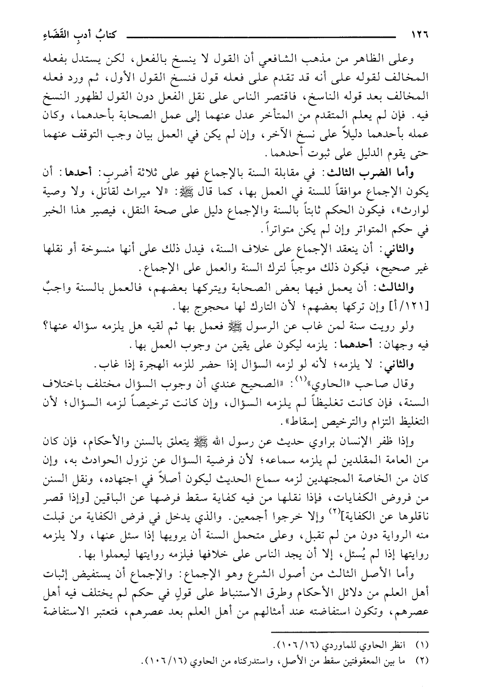 وإذا ظفر الإنسان براوي حديث عن رسول الله صلى الله عليه وسلم يتعلق بالسنن والأحكام، فإن كان من العامة المقلدين لم يلزمه سماعه؛ لأن فرضية السؤال عن نزول الحوادث به، وإن كان من الخاصة المجتهدين لزمه سماع الحديث ليكون أصلًا في اجتهاده، ونقل السنن من فروض الكفايات، فإذا نقلها من فيه كفاية سقط فرضها عن الباقين [وإذا قصر ناقلوها عن الكفاية] وإلا خرجوا أجمعين. والذي يدخل في فرض الكفاية من قبلت منه الرواية دون من لم تقبل، وعلى محتمل السنة أن يرويها إذا سئل عنها، ولا يلزمه روايتها إذا لم يُسئل، إلا أن يجد الناس على خلافها فيلزمه روايتها ليعملوا بها.