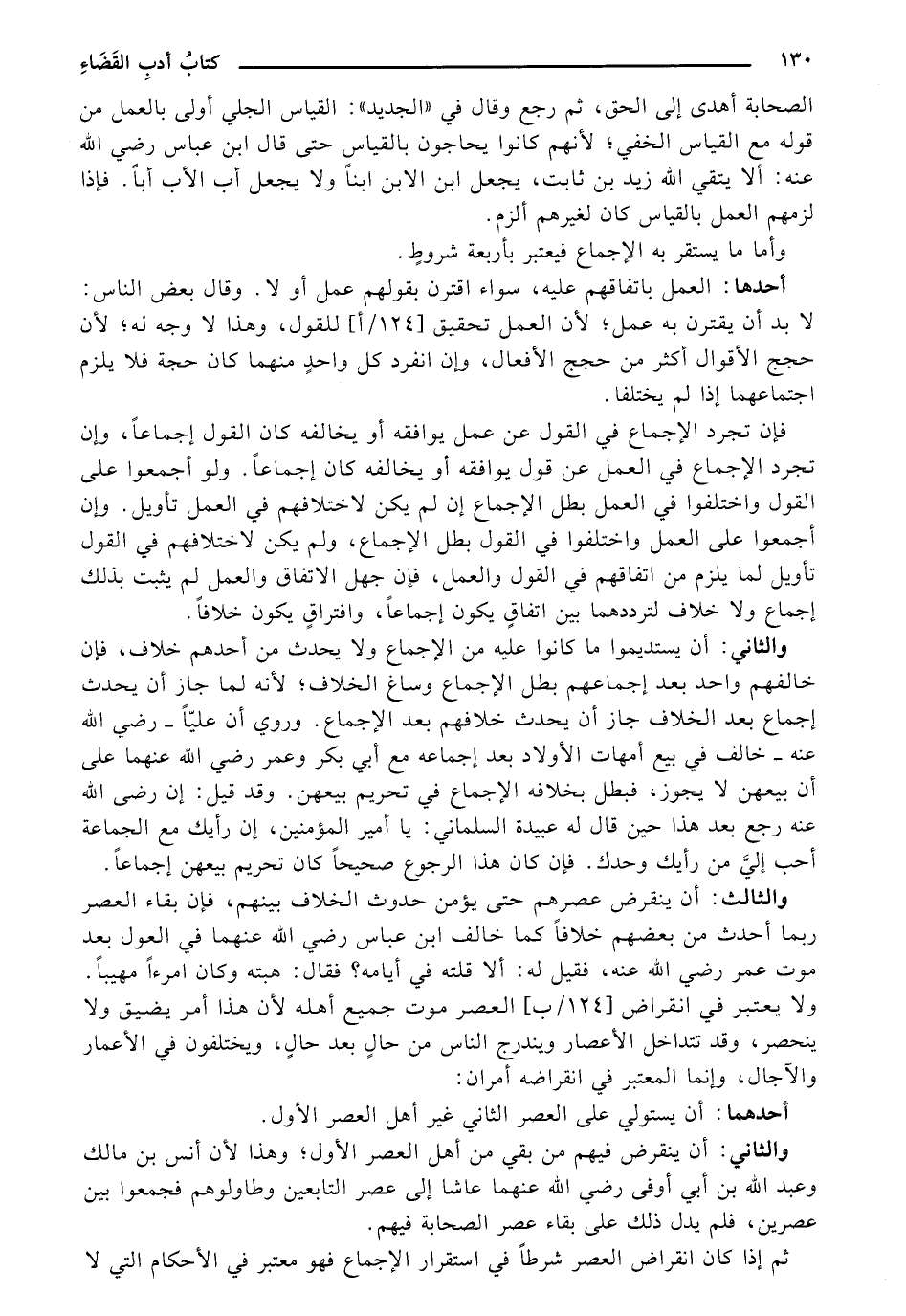 والثالث: أن ينقرض عصرهم حتى يؤمن حدوث الخلاف بينهم، فإن بقاء العصر ربما أحدث من بعضهم خلافًا كما خالف ابن عباس رضي الله عنهما في العول بعد موت عمر رضي الله عنه، فقيل له: ألا قلته في أيامه؟ فقال: هبته وكان امرءًا مهيبًا. ولا يعتبر في انقراض [124/ ب] العصر موت جميع أهله لأن هذا أمر يضيق ولا ينحصر، وقد تتداخل الأعصار ويندرج الناس من حالٍ بعد حالٍ، ويختلفون في الأعمار والآجال، وإنما المعتبر في انقراضه أمران: