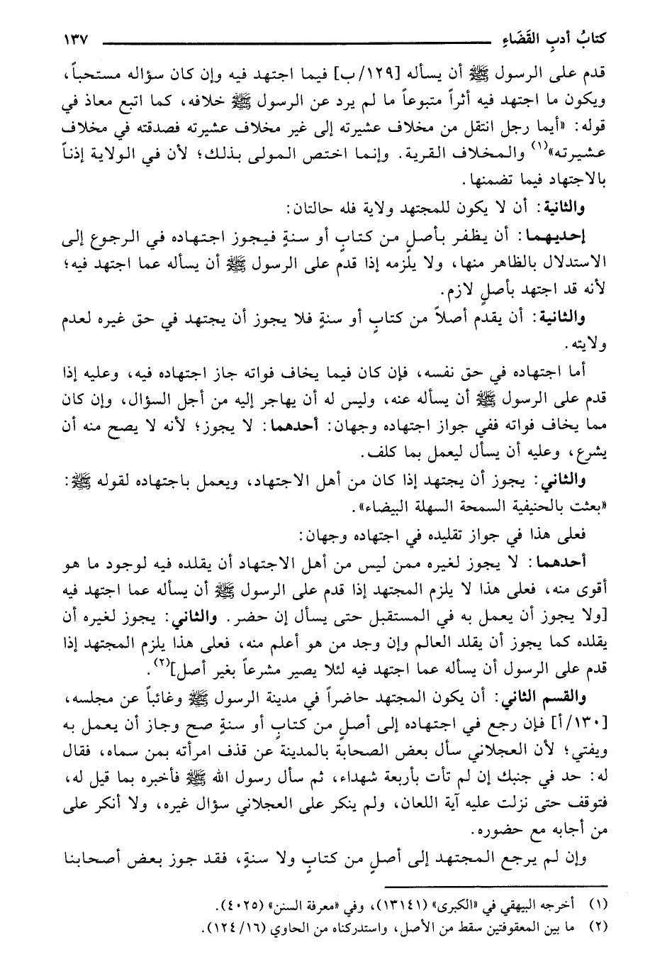 قدم على الرسول صلى الله عليه وسلم أن يسأله [129/ب] فيما اجتهد فيه وإن كان سؤاله مستحباً، ويكون ما اجتهد فيه أثراً متبوعاً ما لم يرد عن الرسول صلى الله عليه وسلم خلافه، كما اتبع معاذ في قوله: "أيما رجل انتقل من مخلاف عشيرته إلى غير مخلاف عشيرته فصدقته في مخلاف عشيرته" والمخلاف القربة. وإنما اختص المولى بذلك؛ لأن في الولاية إذناً بالاجتهاد فيما تضمنها.