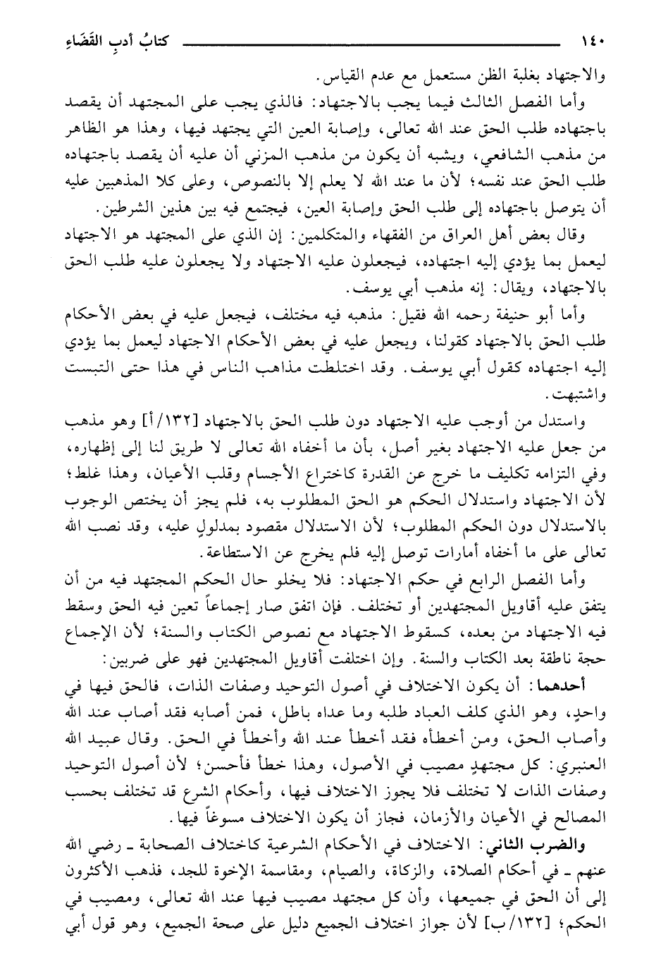وأما الفصل الرابع في حكم الاجتهاد: فلا يخلو حال الحكم المجتهد فيه من أن يتفق عليه أقاويل المجتهدين أو تختلف. فإن اتفق صار إجماعاً تعين فيه الحق وسقط فيه الاجتهاد من بعده، كسقوط الاجتهاد مع نصوص الكتاب والسنة؛ لأن الإجماع حجة ناطقة بعد الكتاب والسنة. وإن اختلفت أقاويل المجتهدين فهو على ضربين: