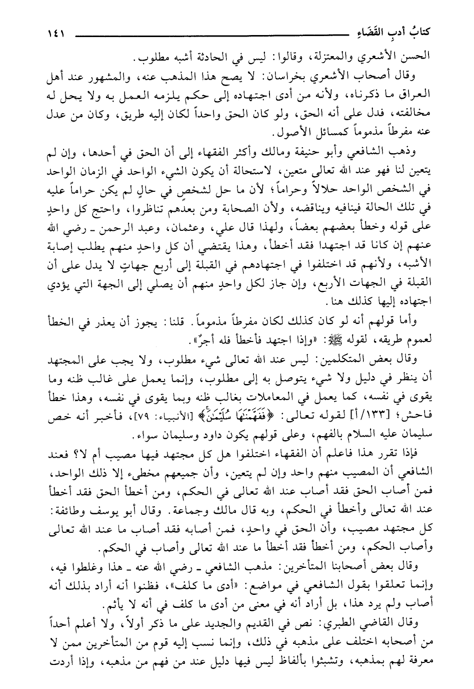 وذهب الشافعي وأبو حنيفة ومالك وأكثر الفقهاء إلى أن الحق في أحدها، وإن لم يتعين لنا فهو عند الله تعالى متعين، لاستحالة أن يكون الشيء الواحد في الزمان الواحد في الشخص الواحد حلالاً وحراماً؛ لأن ما حل لشخص في حال لم يكن حراماً عليه في تلك الحالة فينافيه ويناقضه، ولأن الصحابة ومن بعدهم تناظروا، واحتج كل واحد على قوله وخطأ بعضهم بعضاً، ولهذا قال علي، وعثمان، وعبد الرحمن- رضي الله عنهم إن كانا قد اجتهدا فقد أخطأ، وهذا يقتضي أن كل واحد منهم يطلب إصابة الأشبه، ولأنهم فد اختلفوا في اجتهادهم في القبلة إلى أربع جهات لا يدل على أن القبلة في الجهات الأربع، وإن جاز لكل واحد منهم أن يصلي إلى الجهة التي يؤدي اجتهاده إليها كذلك هنا.