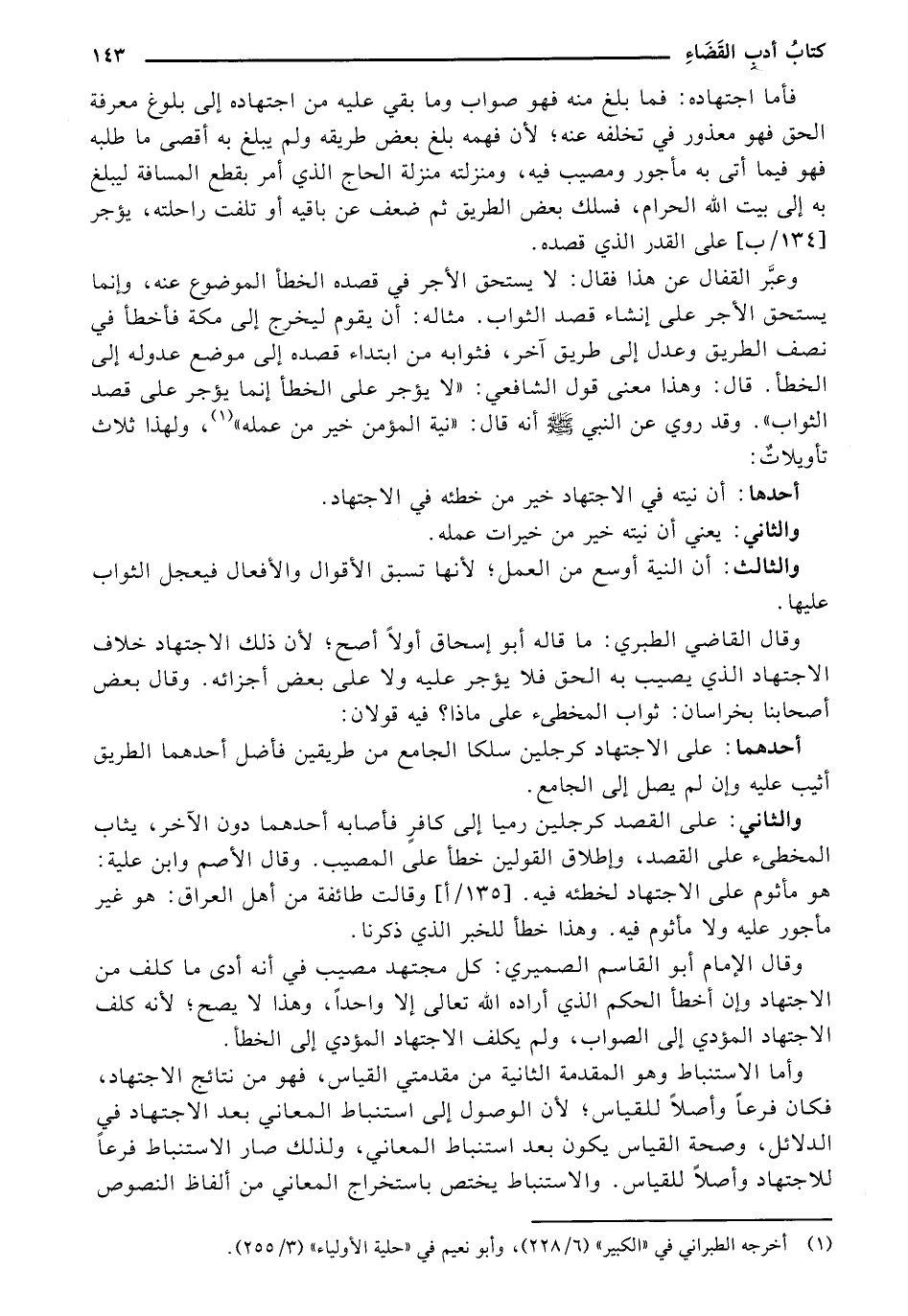 فأما اجتهاده: فما بلغ منه فهو صواب وما بقى عليه من اجتهاده إلى بلوغ معرفة الحق فهو معذور في تخلفه عنه؛ لأن فهمه بلغ بعض طريقه ولم يبلغ به أقصى ما طلبه فهو فيما أتى به مأجور ومصيب فيه، ومنزلته منزلة الحاج الذي أمر بقطع المساقة ليبلغ به إلى بيت الله الحرام، فسلك بعض الطريق ثم ضعف عن باقية أ, تلفت راحلته، يؤجر [134/ب] على القدر الذي قصده.