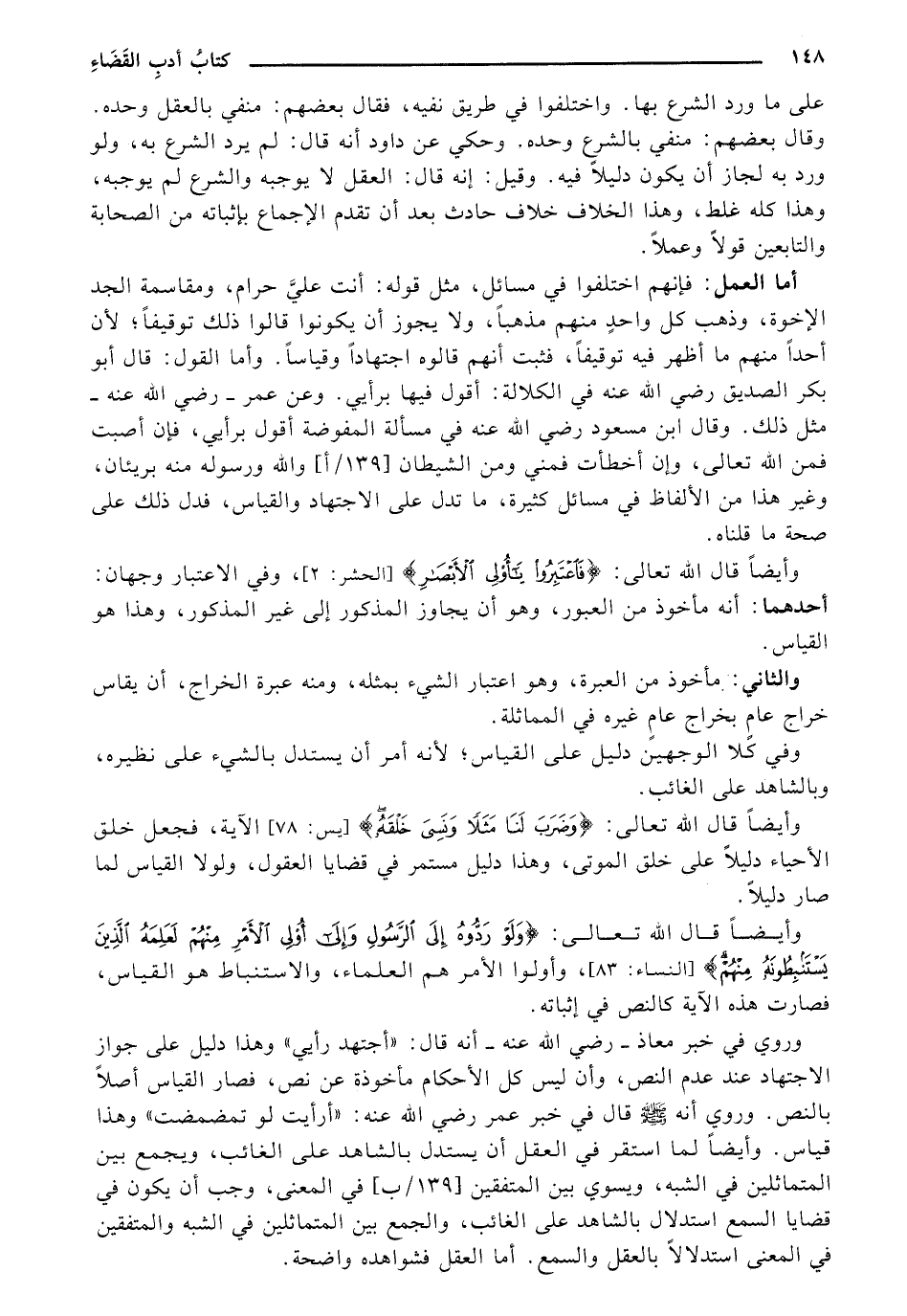 وأيضاً قال الله تعالى: {ولَوْ رَدُّوهُ إلَى الرَّسُولِ وإلَى أُوْلِي الأَمْرِ مِنْهُمْ لَعَلِمَهُ الَّذِينَ يَسْتَنبِطُونَهُ مِنْهُمْ} [النساء: 83]، وأولوا الأمر هم العلماء، والاستنباط هو القياس، فصارت هذه الآية كالنص في إثباته.