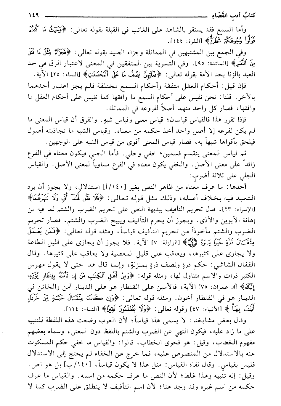 وقال بعض مشايخنا: لا يسمى هذا قياساً؛ لأن العرب وضعت هذه اللفظة للتنبيه على ما زاد عليه، فيكون النهي عن الضرب والشتم باللفظ دون المعنى، وسماه بعضهم مفهوم الخطاب، وقيل: هو فحوي الخطاب، قالوا: والقياس ما خفي حكم المسكوت عنه بالاستدلال من المنصوص عليه، فما خرج عن الخفاء لم يحتج إلى الاستدلال فليس بقياس. وقال نفاة القياس: مثل هذا لا يكون قياساً، [140/ب] بل هو نص. وقيل: إنه تنبيه وهذا غلط؛ لأن النص ما عرف حكمه من اسمه. والقياس ما عرف حكمه من اسم غيره وقد وجد هنا؛ لأن اسم التأفيف لا ينطلق على الضرب كما لا