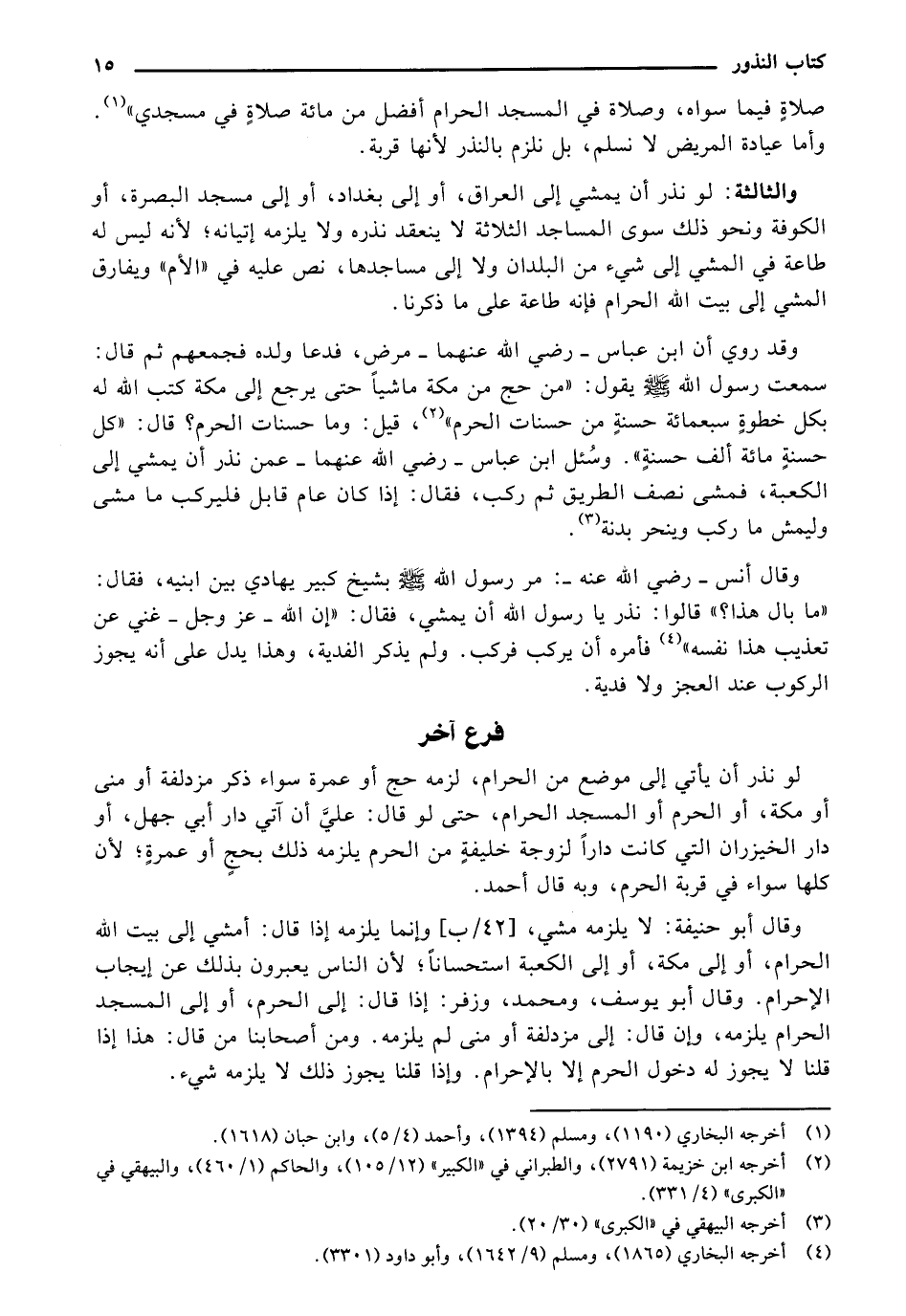 صلاةٍ فيما سواه، وصلاة في المسجد الحرام أفضل من مائة صلاةٍ في مسجدي". وأما عيادة المريض لا نسلم، بل نلزم بالنذر لأنها قربة.