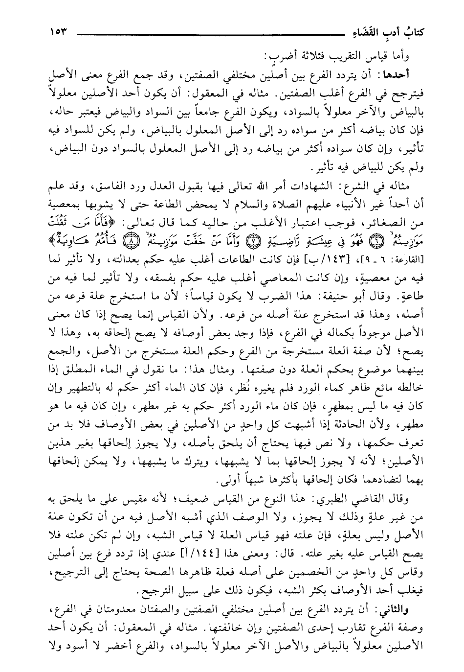 مثاله في الشرع: الشهادات أمر الله تعالى فيها بقبول العدل ورد الفاسق، وقد علم أن أحداً غير الأنبياء عليهم الصلاة والسلام لا بمحض الطاعة حتى لا يشوبها بمعصية من الصغائر، فوجب اعتبار الأغلب من حاليه كما قال تعالى: {فَأَمَّا مَن ثَقُلَتْ مَوَازِينُهُ، فَهُوَ فِي عِيشَةٍ رَّاضِيَةٍ، وأَمَّا مَنْ خَفَّتْ مَوَازِينُهُ، فَأُمُّهُ هَاوِيَةٌ} [القارعة:6 - 9]، [143/ ب] فإن كانت الطاعات أغلب عليه حكم بعدالته، ولا تأثير لما فيه من معصية، وإن كانت المعاصي أغلب عليه حكم بفسقه، ولا تأثير لما فيه من طاعة. وقال أبو حنيفة: هذا الضرب لا يكون قياساً، لأن ما استخرج علة فرعه من أصله، وهذا قد استخرج علة أصله من فرعه. ولأن القياس إنما يصح إذا كان معنى الأصل موجوداً بكماله في الفرع، فإذا وجد بعض أوصافه لا يصح إلحاقه به، وهذا لا يصح، لأن صفة العلة مستخرجة من الفرع وحكم العلة مستخرج من الأصل، والجمع بينهما موضوع بحكم العلة دون صفتها. ومثال هذا: ما نقول في الماء المطلق إذا خالطه مائع طاهر كماء الورد فلم يغيره نظر، فإن كان الماء أكثر حكم له بالتطهير وإن كان فيه ما ليس بمطهر، فإن كان ماء الورد أكثر حكم به غير مطهر، وإن كان فيه ما هو مطهر، ولأن الحادثة إذا أشبهت كل واحد من الأصلين في بعض الأوصاف فلا بد من تعرف حكمها، ولا نصفيها يحتاج أن يلحق بأصله، ولا يجوز إلحاقها بغير هذين الأصلين، لأنه لا يجوز إلحاقها بما لا يشبهها، ولا يمكن إلحاقها بهما لتضادهما فكان إلحاقها بأكثرها شبهاً أولى.