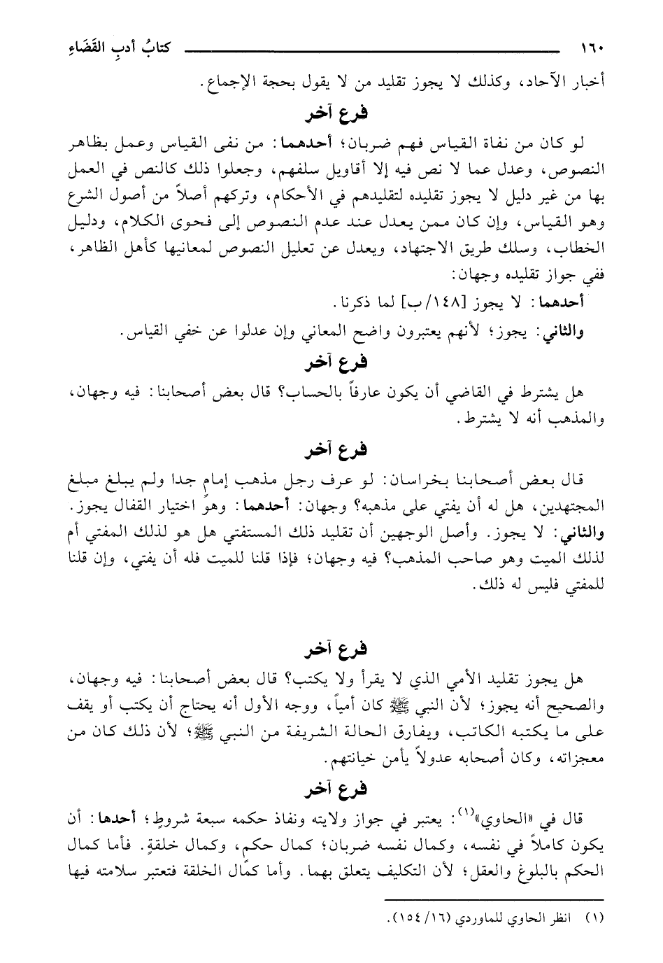 هل يجوز تقليد الأمي الذي لا يقرأ ولا يكتب؟ قال بعض أصحابنا: فيه وجهان، والصحيح أنه يجوز، لأن النبي صلى الله عليه وسلم كان أمياً، ووجه الأول أنه يحتاج أن يكتب أو يقف على ما يكتبه الكاتب، ويفارق الحالة الشريفة من النبي صلى الله عليه وسلم، لأن ذلك كان من معجزاته، وكان أصحابه عدولاً يأمن خيانتهم.