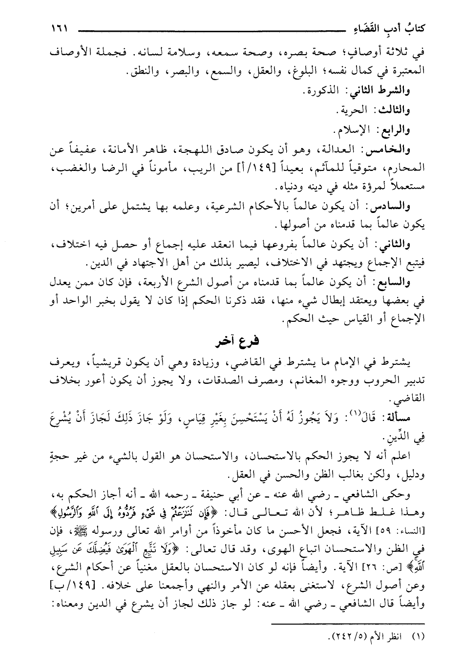 والخامس: العدالة, وهو أن يكون صادق اللهجة, ظاهر الأمانة, عفيفًا عن المحارم, متوقيًا للمآثم, بعيدًا [149/ أ] من الريب, مأمونًا في الرضا والغضب, مستعملًا لمرؤة مثله في دينه ودنياه.