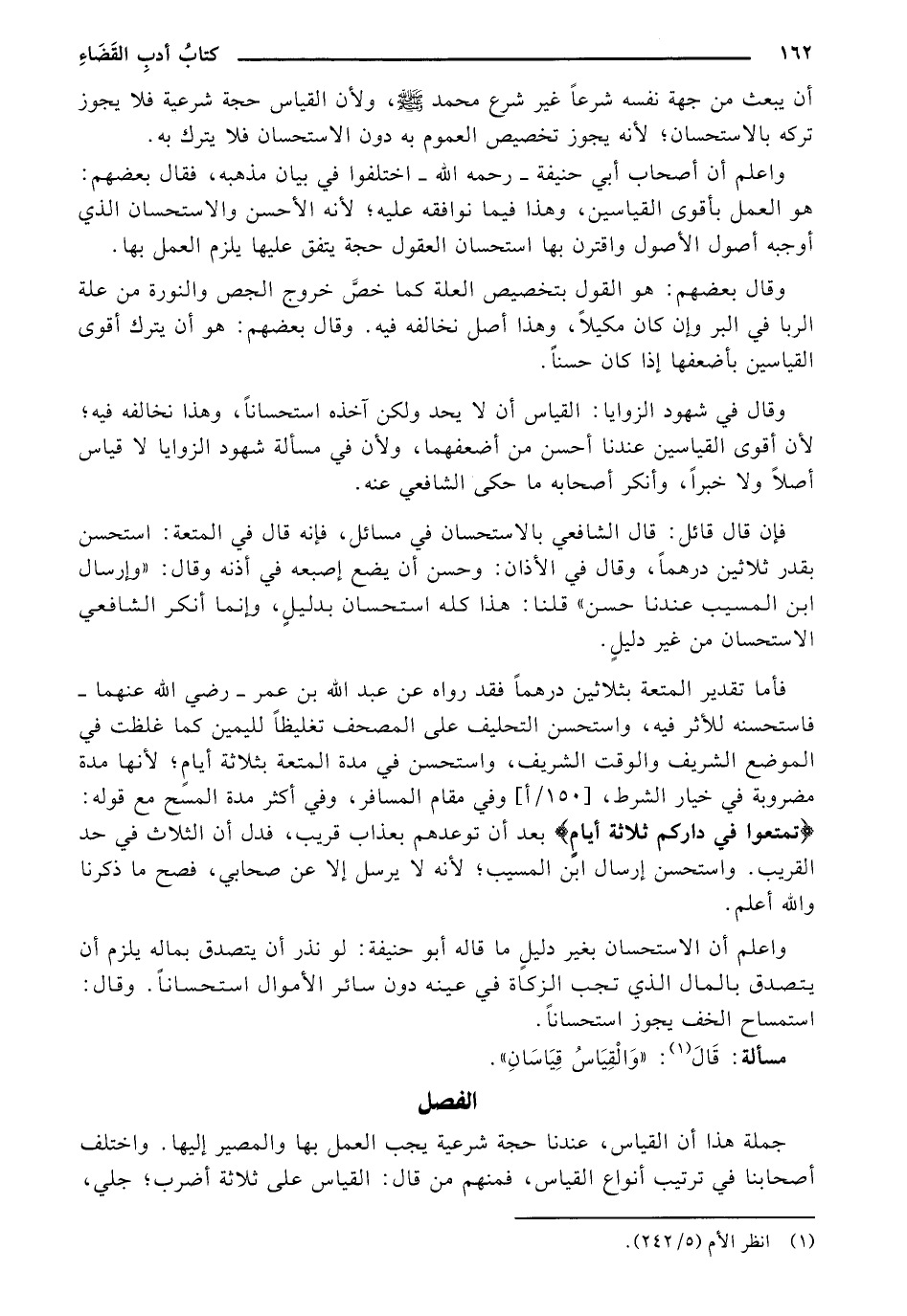 واعلم أن أصحاب أبي حنيفة- رحمه الله- اختلفوا في بيان مذهبه, فقال بعضهم هو العمل بأقوى القياسين, وهذا فيما نوافقه عليه؛ لأنه الأحسن والاستحسان الذي أوجبه أصول الأصول واقترن بها استحسان العقول حجة يتفق عليها يلزم العمل بها.