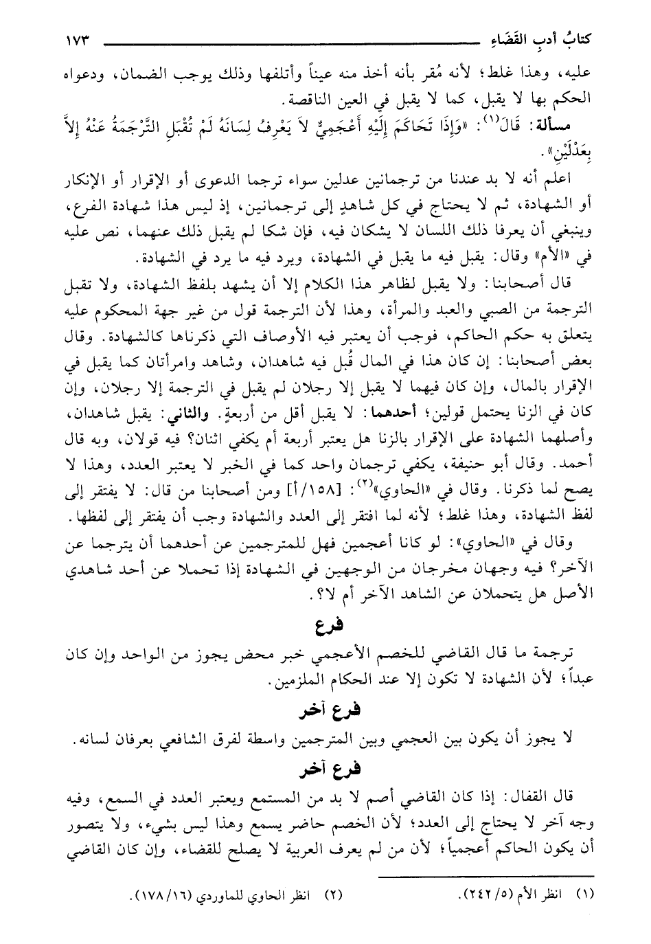 اعلم أنه لا بد عندنا من ترجمانين عدلين سواء ترجما الدعوى أو الإقرار أو الإنكار أو الشهادة, ثم لا يحتاج في كل شاهدٍ إلى ترجمانين, إذ ليس هذا شهادة الفرع, وينبغي أن يعرفا ذلك اللسان لا يشكان فيه, لأن شكا لم يقبل ذلك عنهما, نص عليه في "الأم" وقال: يقبل فيه ما يقبل في الشهادة, ويرد فيه ما يرد في الشهادة.